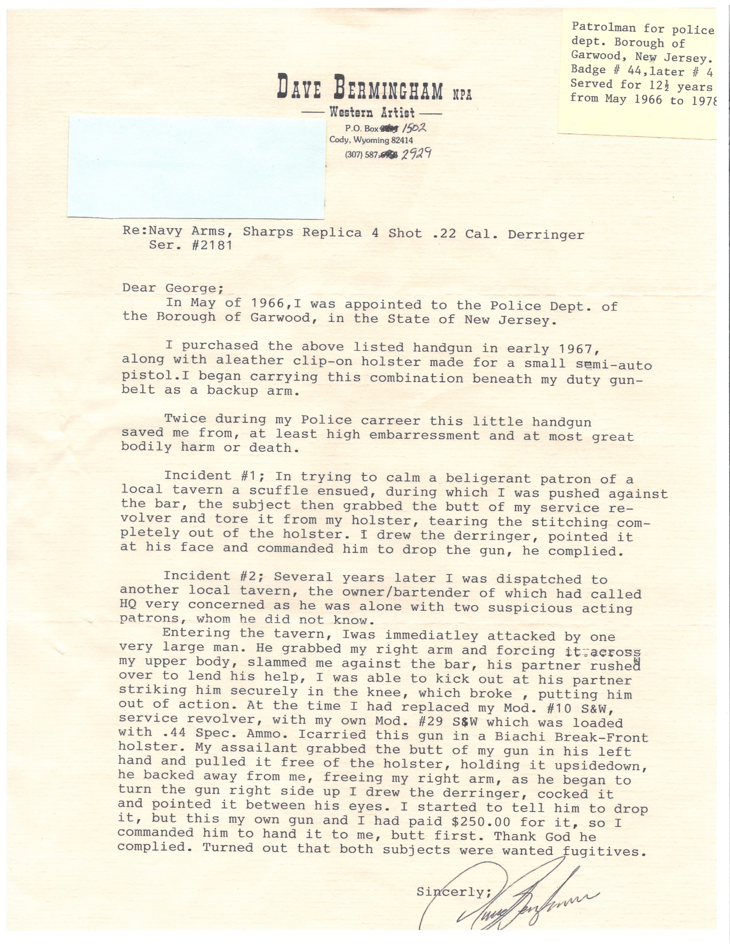 Uberti Sharps .22 LR caliber derringer. Replica Sharps four shot derringer. Comes with a letter from a police officer who carried the gun as a backup. The letter tells a couple of anecdotes about having had to use the little gun. Excellent condition with wooden case.