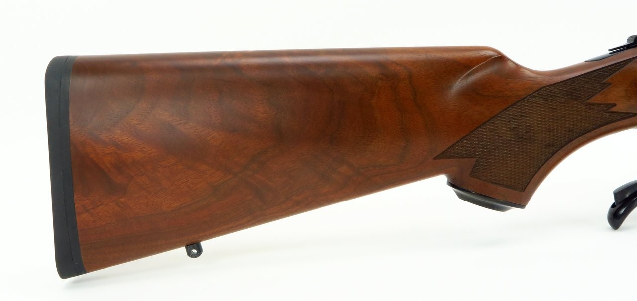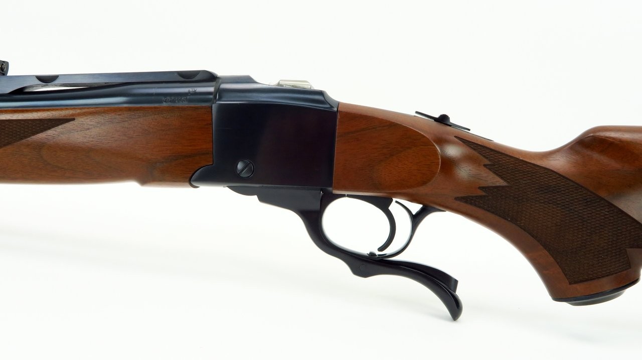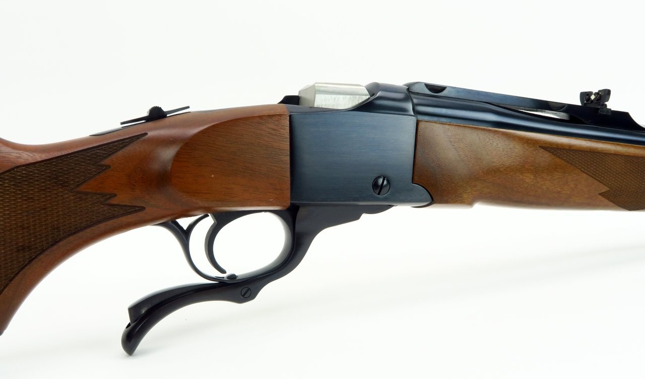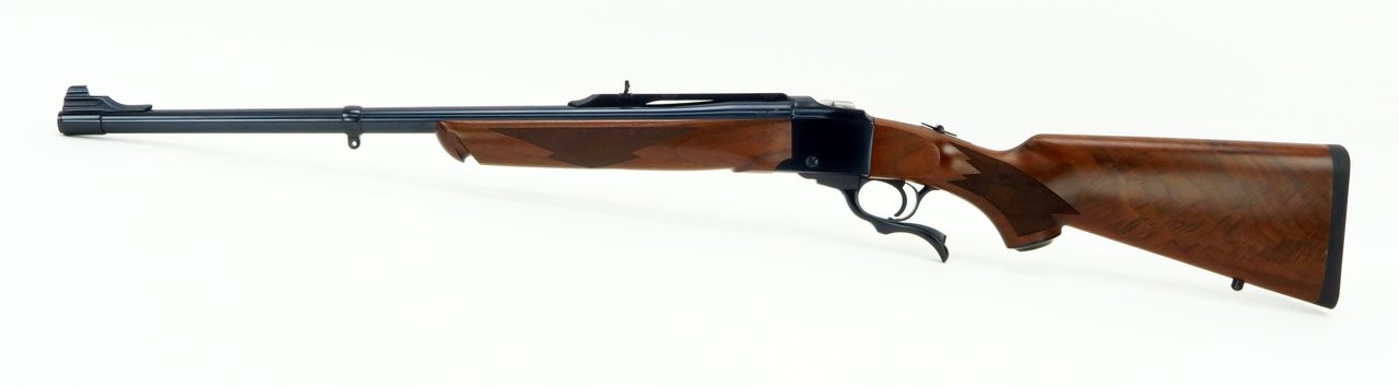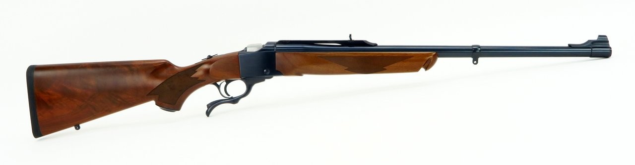 Ruger No. 1 9.3x74R caliber rifle. Tropical rifle in big bore 9.3x74R caliber. Has sling mount on barrel and quarter rib sight, overall excellent condition.