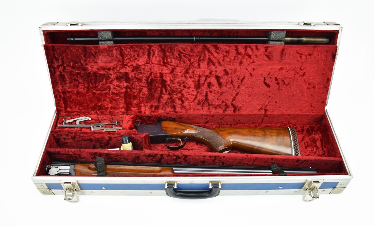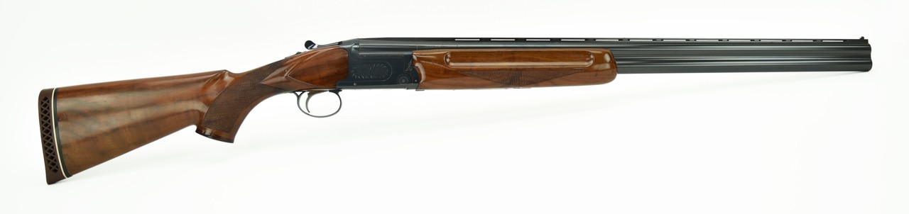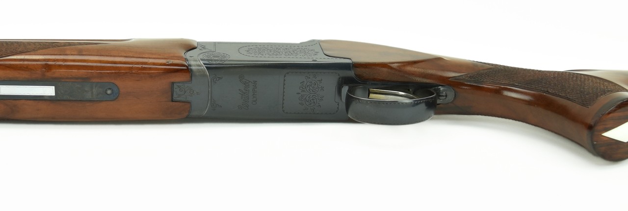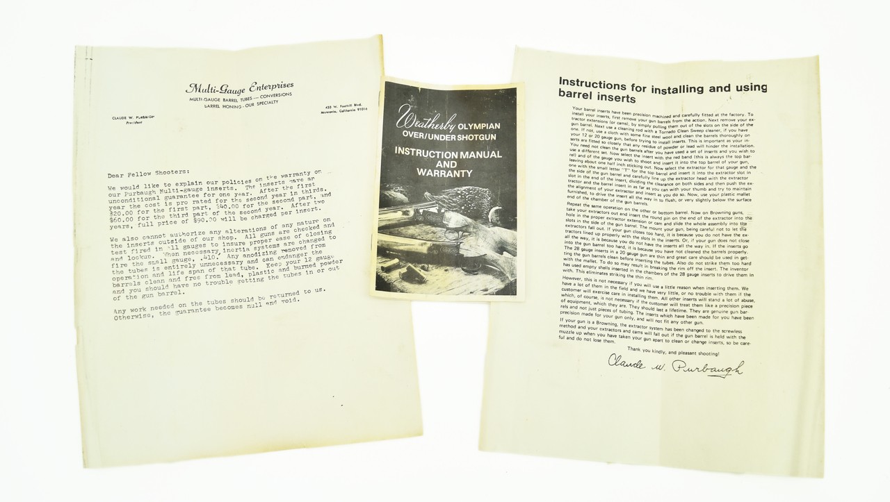 Weatherby Olympian 12 Gauge shotgun. Over/Under skeet gun with 28” barrels and Purbaugh 20, 28, 410 tube set. The barrels have been made improved cylinder/improved cylinder. The stock has been shortened, the LOP is 13”, overall excellent condition with light use, all in a metal Anvil carry case.