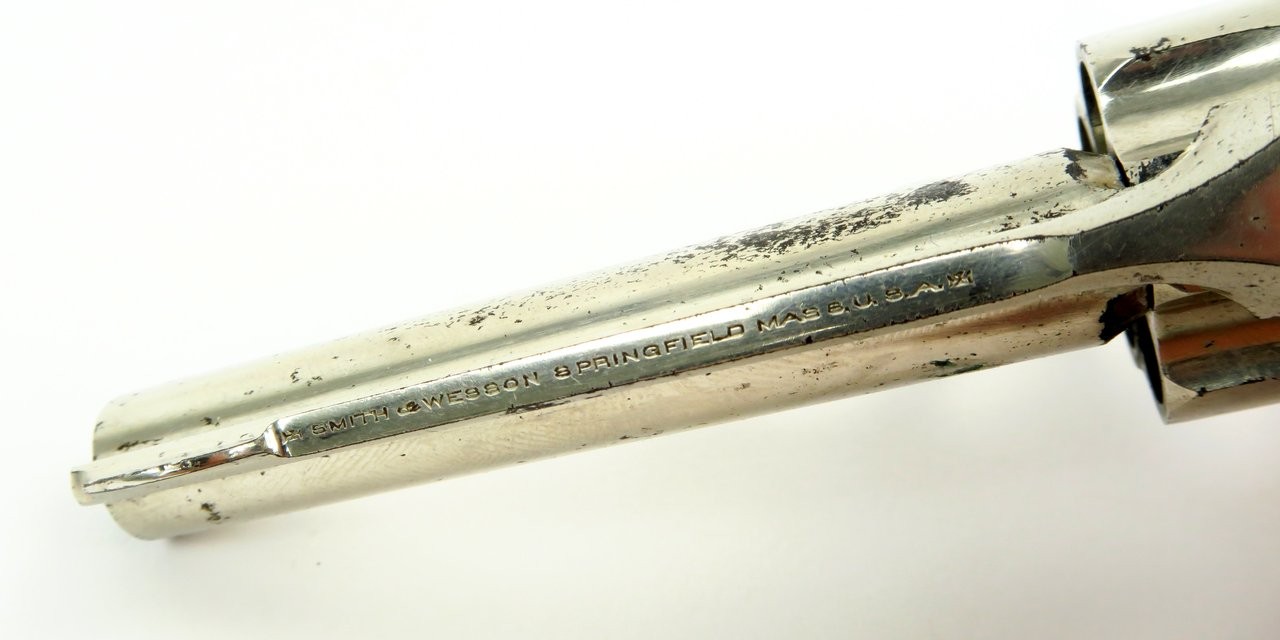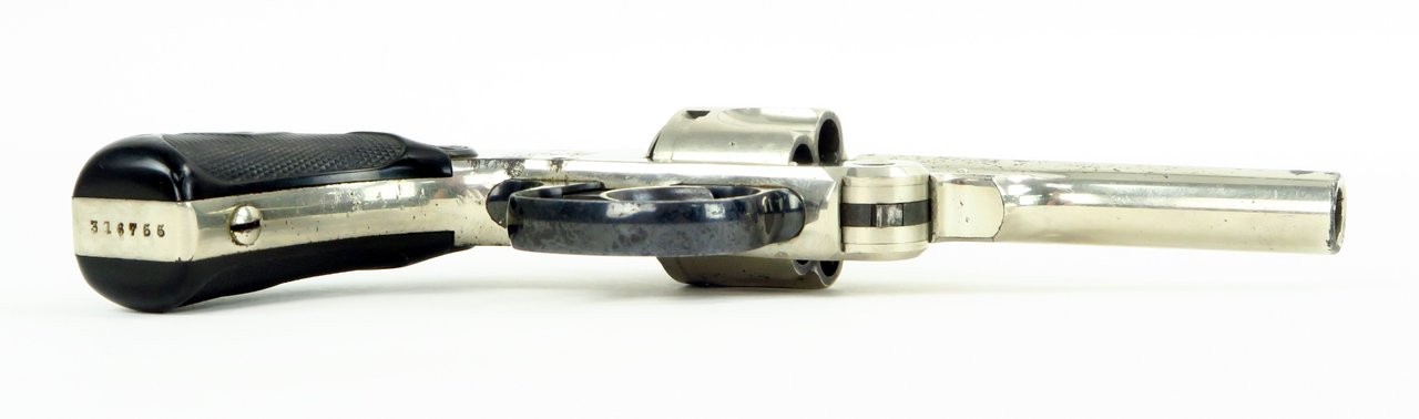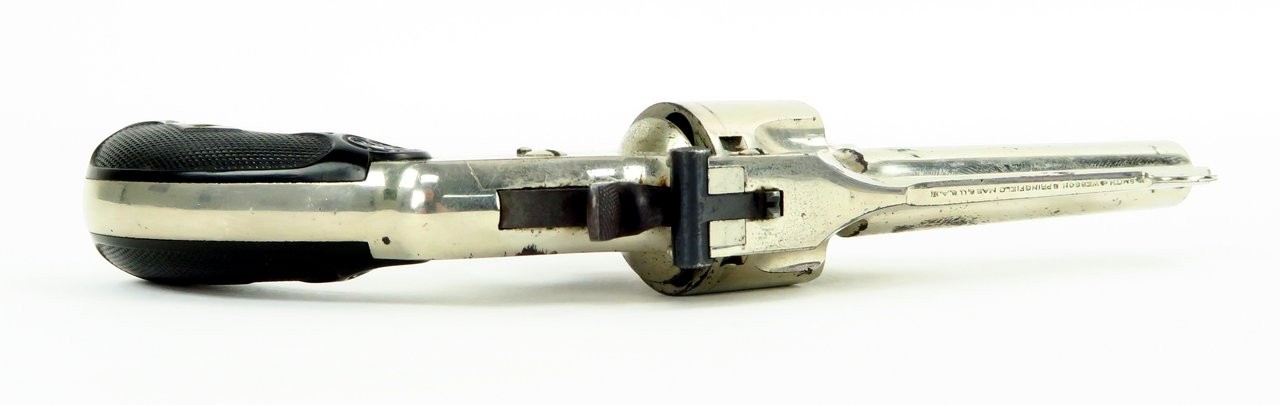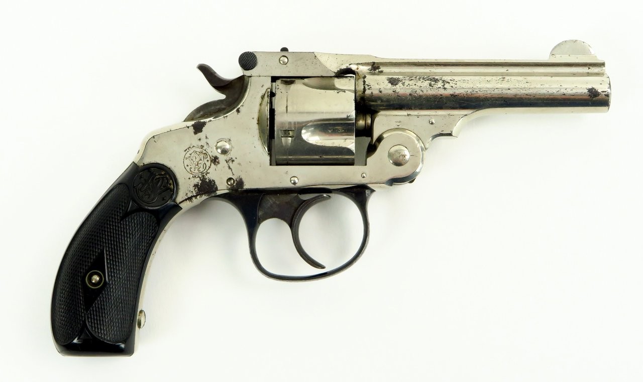 Smith & Wesson Top Break Double Action 5th Model .32 S&W caliber revolver. Modern gun made between 1909 and 1919. 3” barrel. Metal has 90% of the original nickel with a little frosting. Grips are excellent. Case colors on hammer and trigger have turned slightly dark. Action is tight.