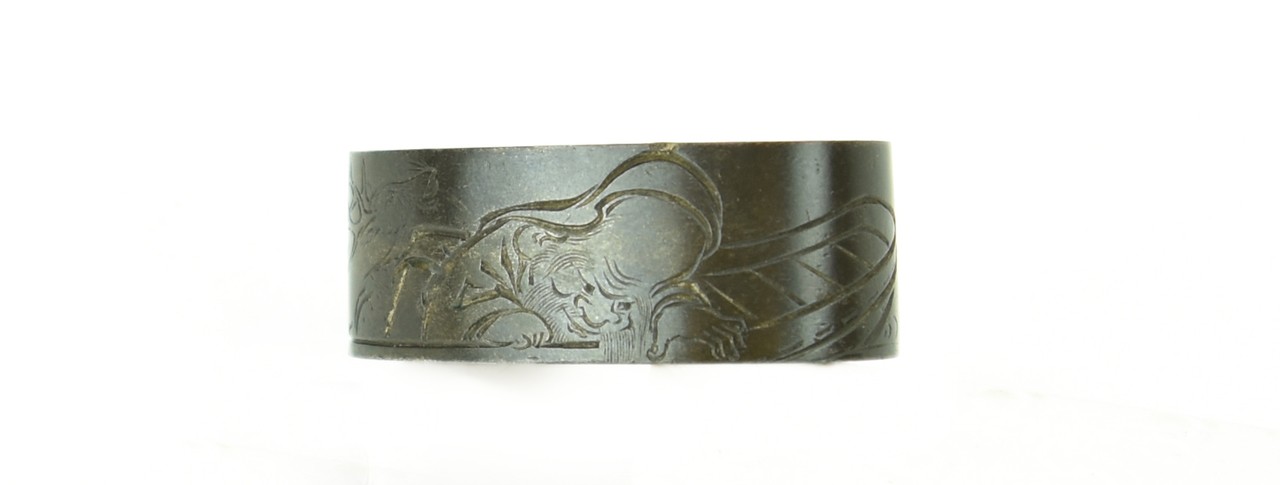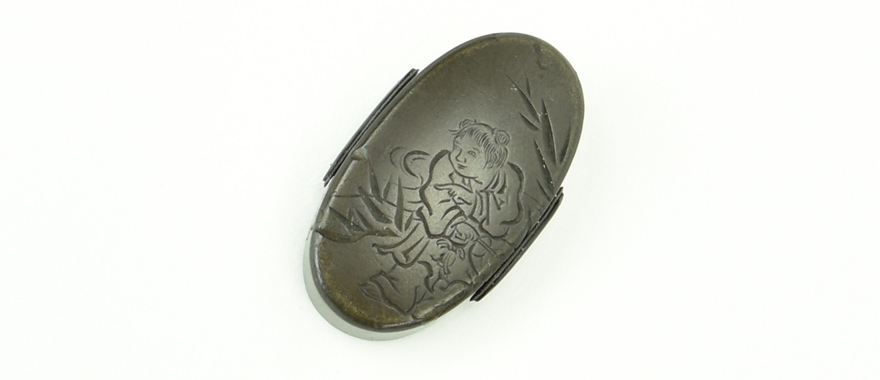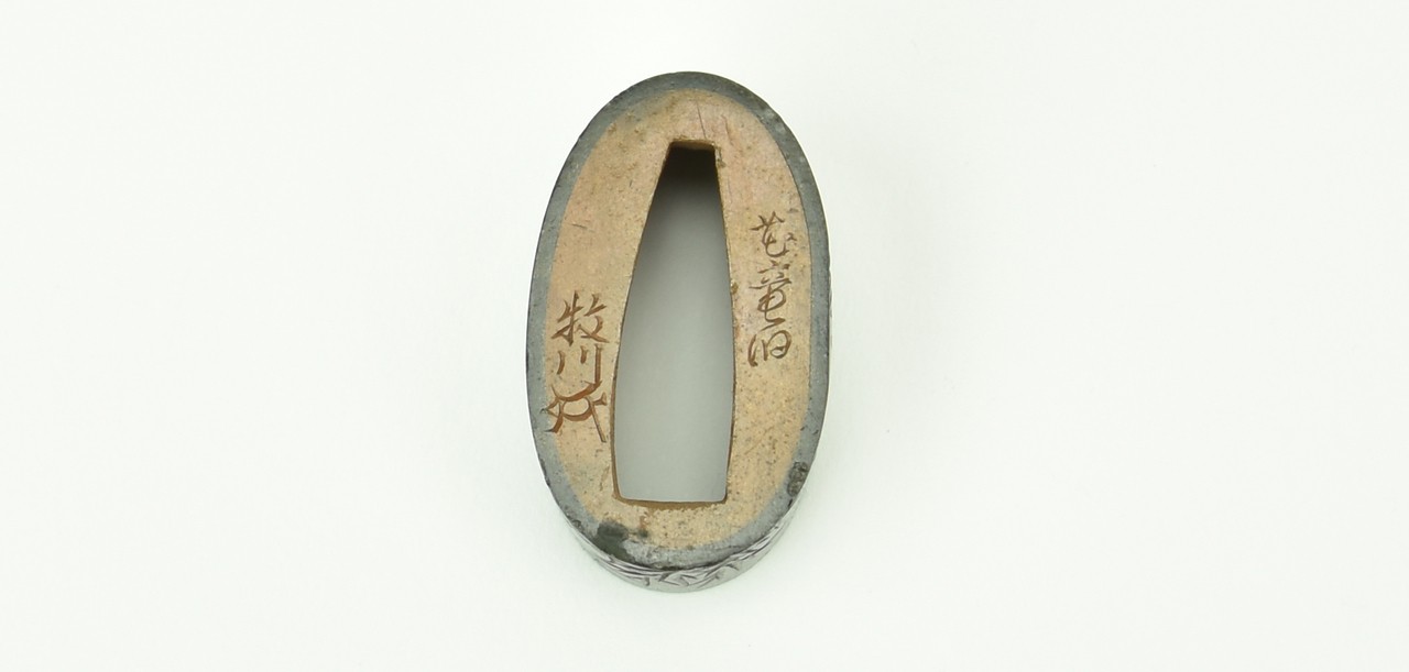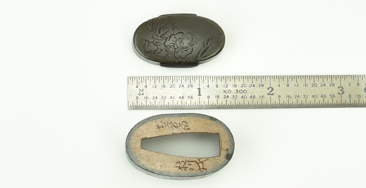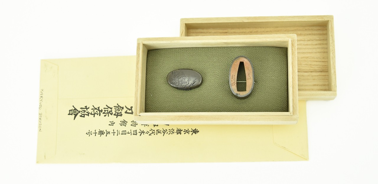 Shakudo Fuchi-Kashira. Decorated with Jurovin and a stag in river boat, attendant carved in katakiri bori. Signed: Karyudo Bokusen. Very fine work with certificate from the N.B.T.H.K.