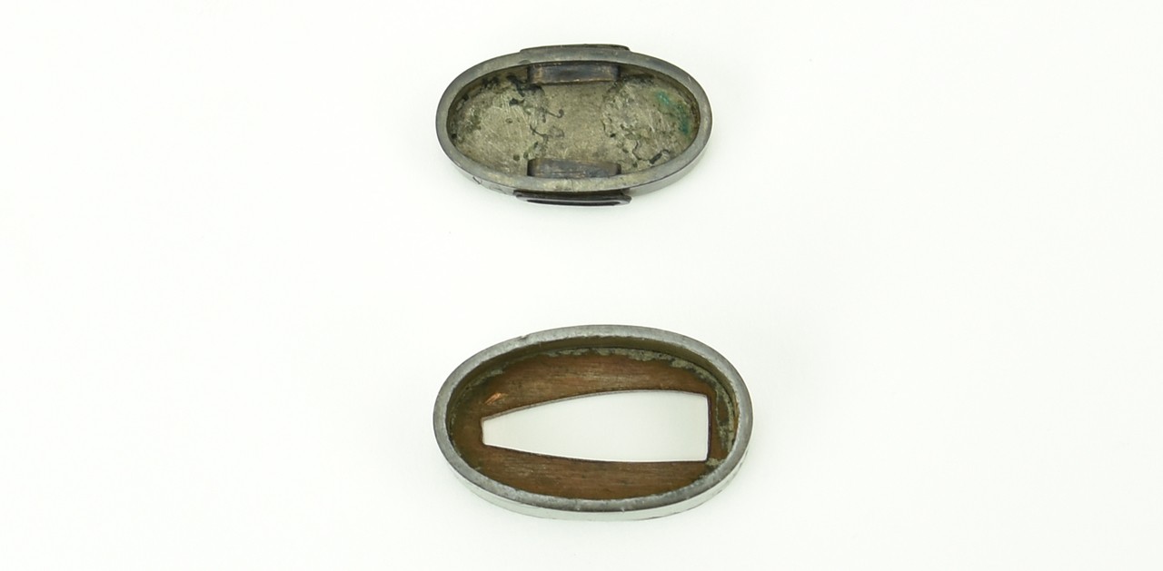 Shakudo Fuchi-Kashira decorated with Jurovin and a stag in river boat (MGJ117)
