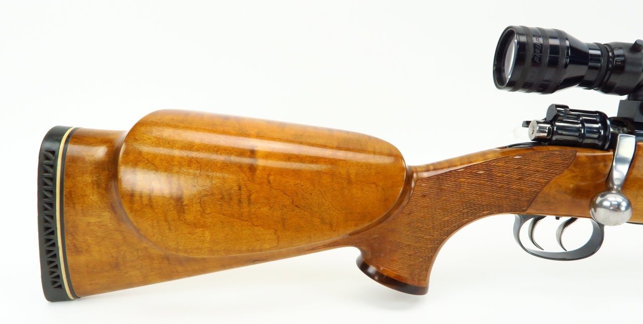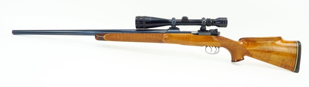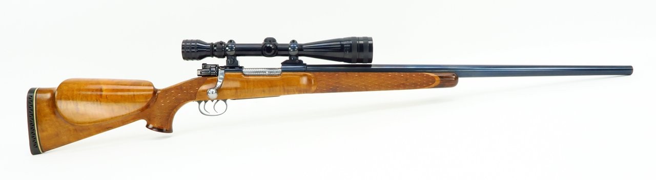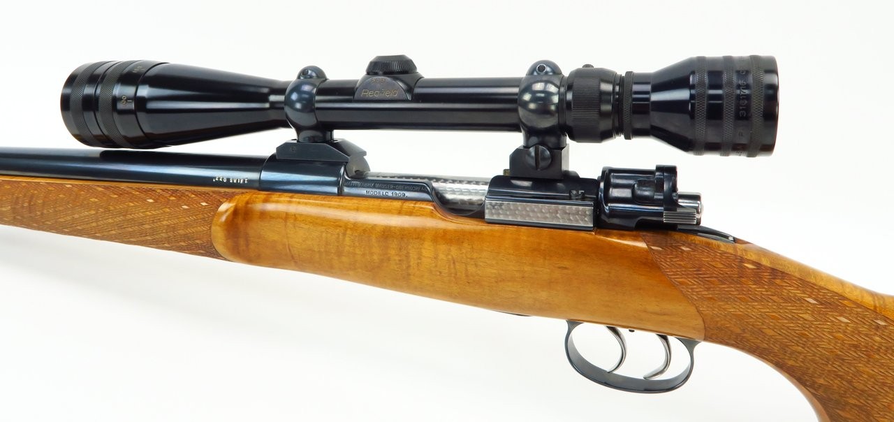 Waffenfabrik-Mauser 1909 Custom .220 Swift caliber rifle. Beautiful customized Mauser action varmint rifle. Has a 26” heavy barrel, jeweled bolt, double set triggers, and high polish blue. The stock is of nicely figured maple with fancy skip-line checkering and rosewood forend tip and pistol grip cap. The buttstock has a rollover cheek piece for a left handed shooter. An interesting and good looking rifle in excellent condition with Redfield 6x18 scope.