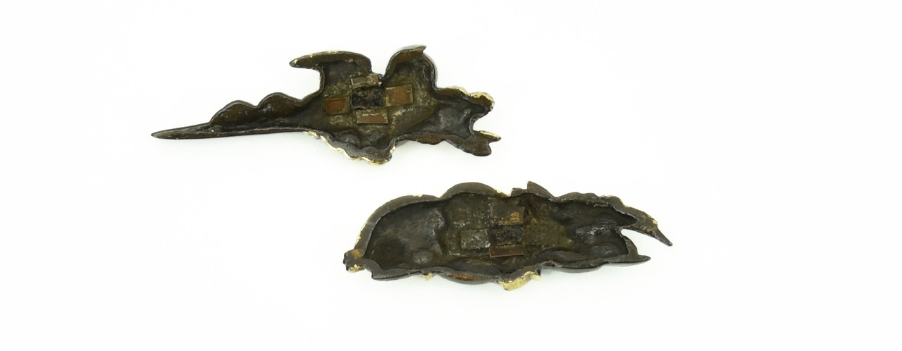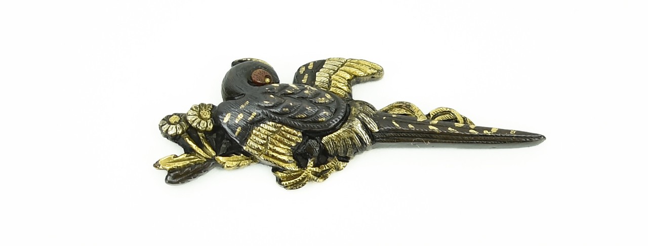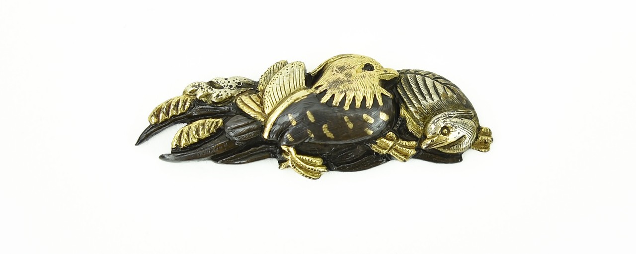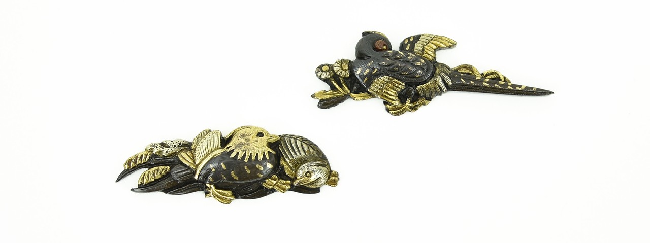 Kinko Menuki. Two Birds on the ground and one Bird in flight. Gold, silver, copper and Shakudo highlights. Good carving. Unsigned.