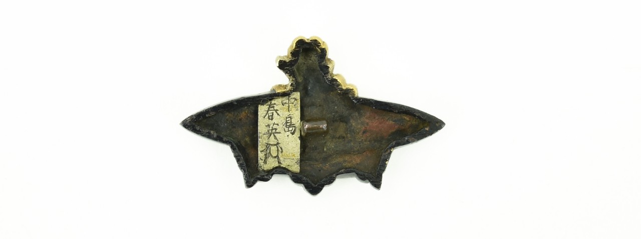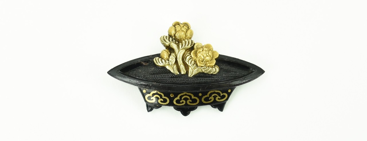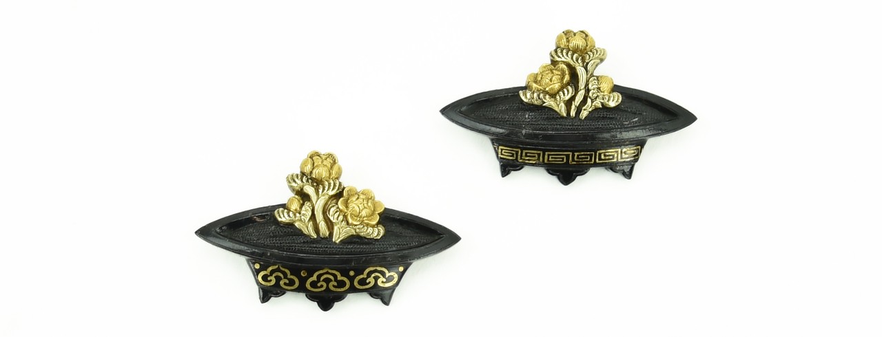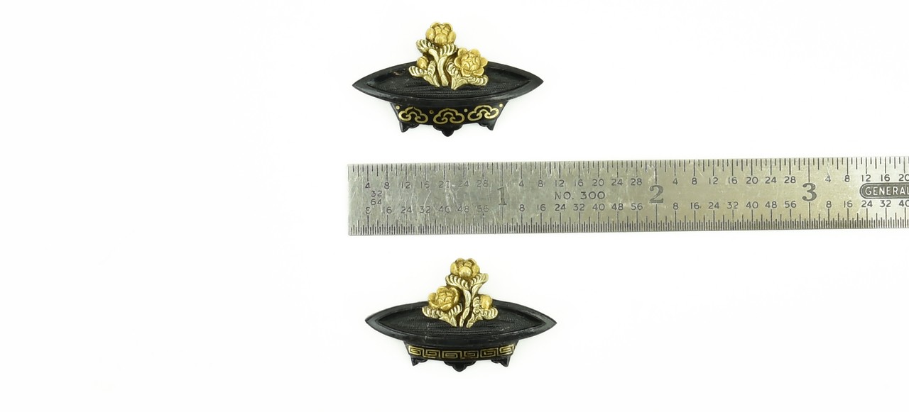 Kinko Menuki. Flowers on Jardinere. Shakudo and gold. Signed: Nakajima Haru Teru Yanagawa School. Mid-19th Century. Lived in Edo to the age of 76.