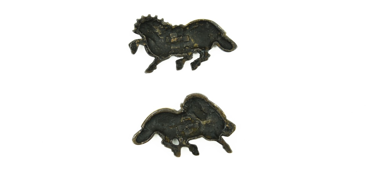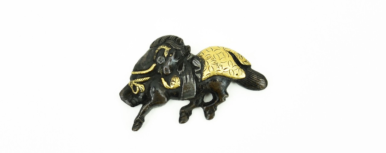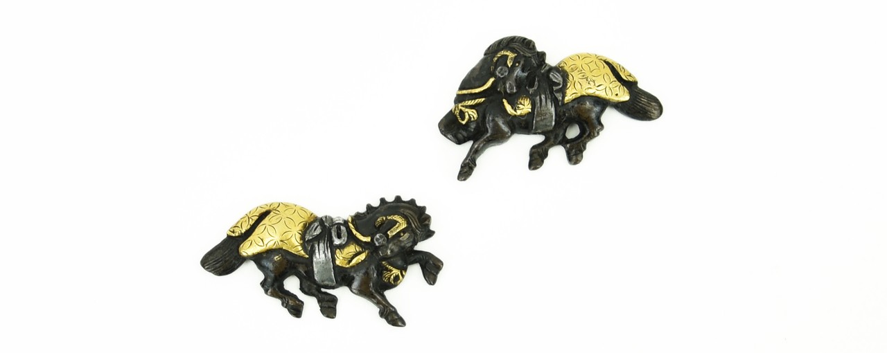 Kinko Menuki. Shakudo horses with shibuichi saddles. Horses reins and saddle blanket are gold. Unsigned. Fine workmanship.