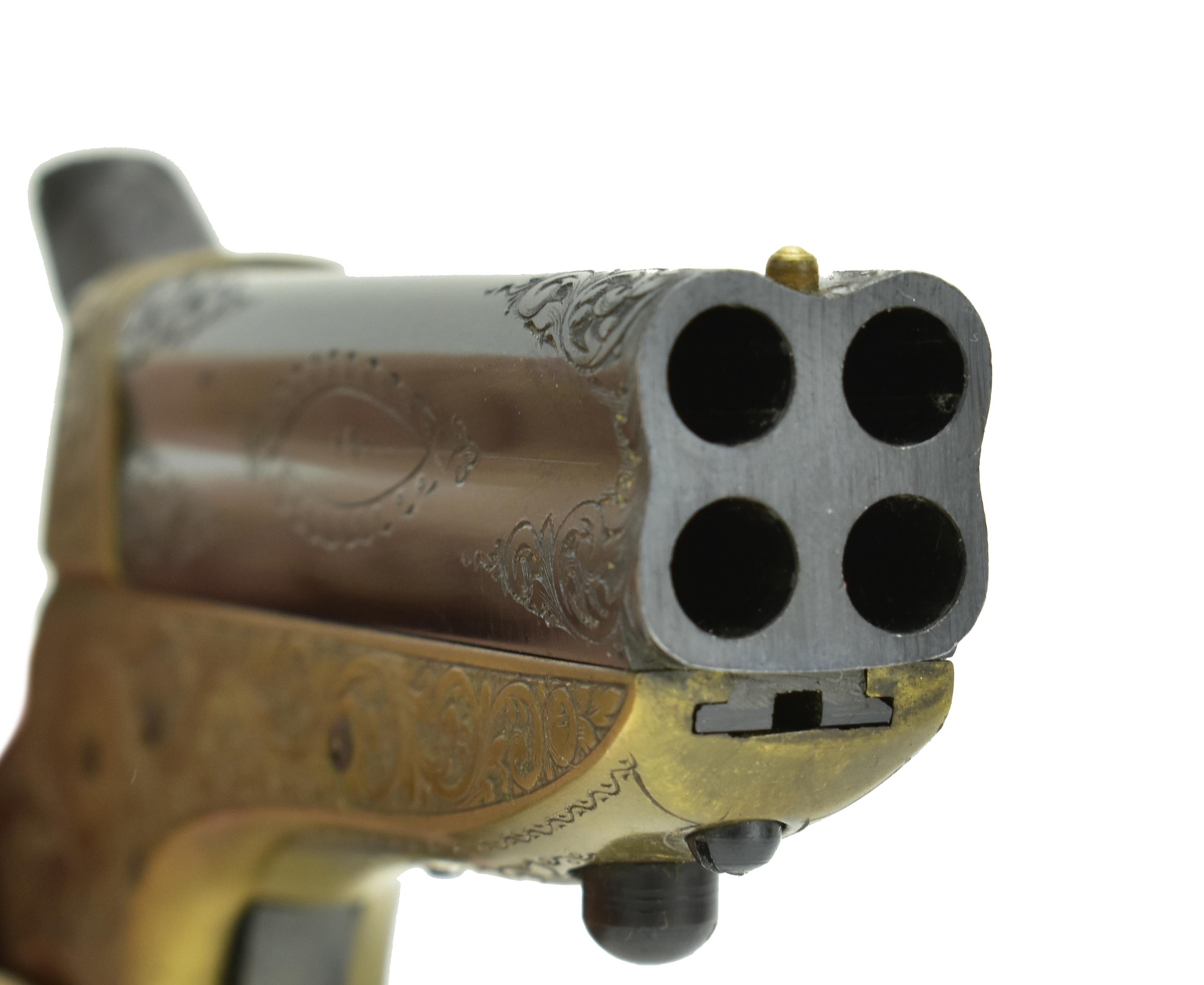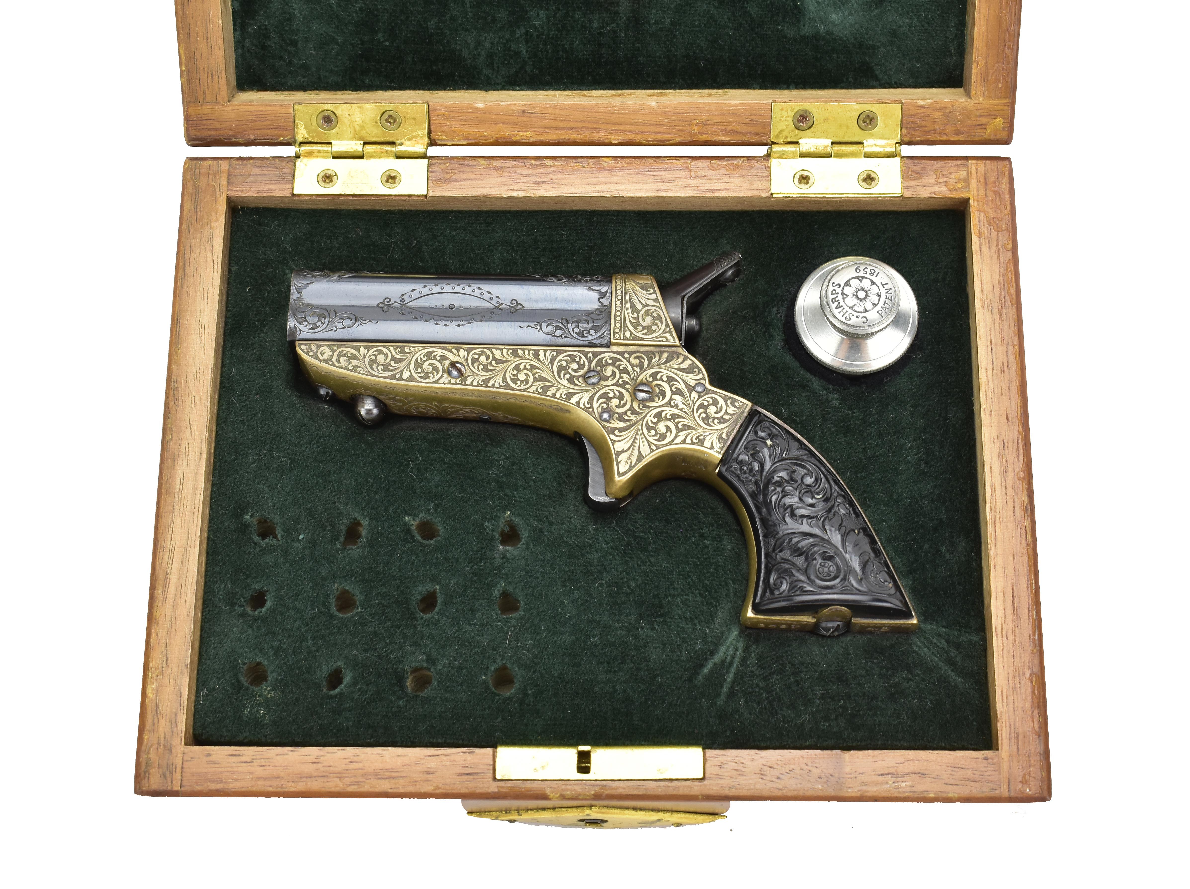 Uberti Sharps .22 LR caliber pistol. Beautiful engraved Sharps four barrel derringer. Excellent condition with case.