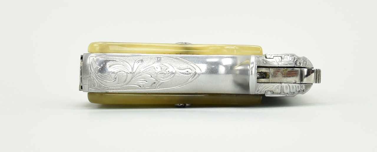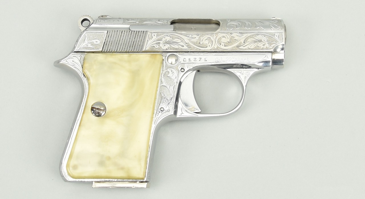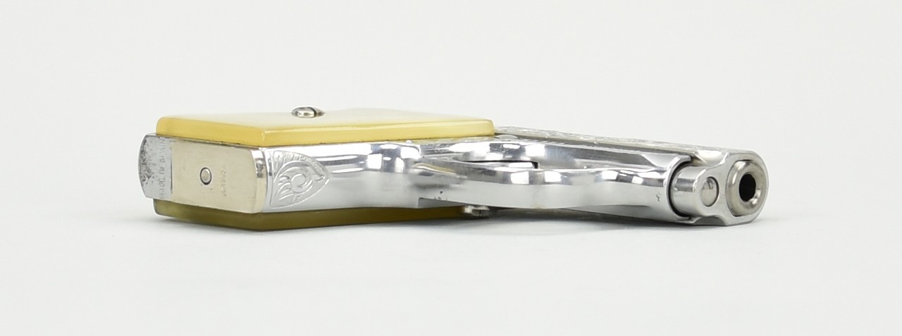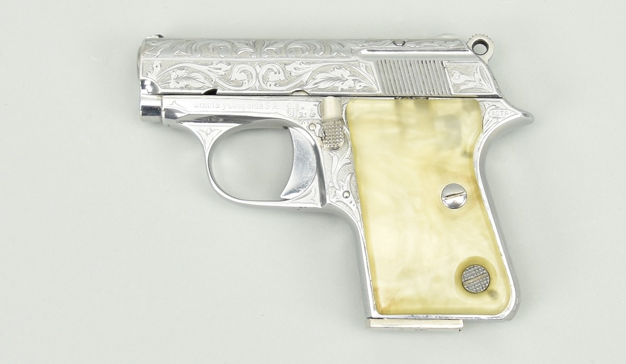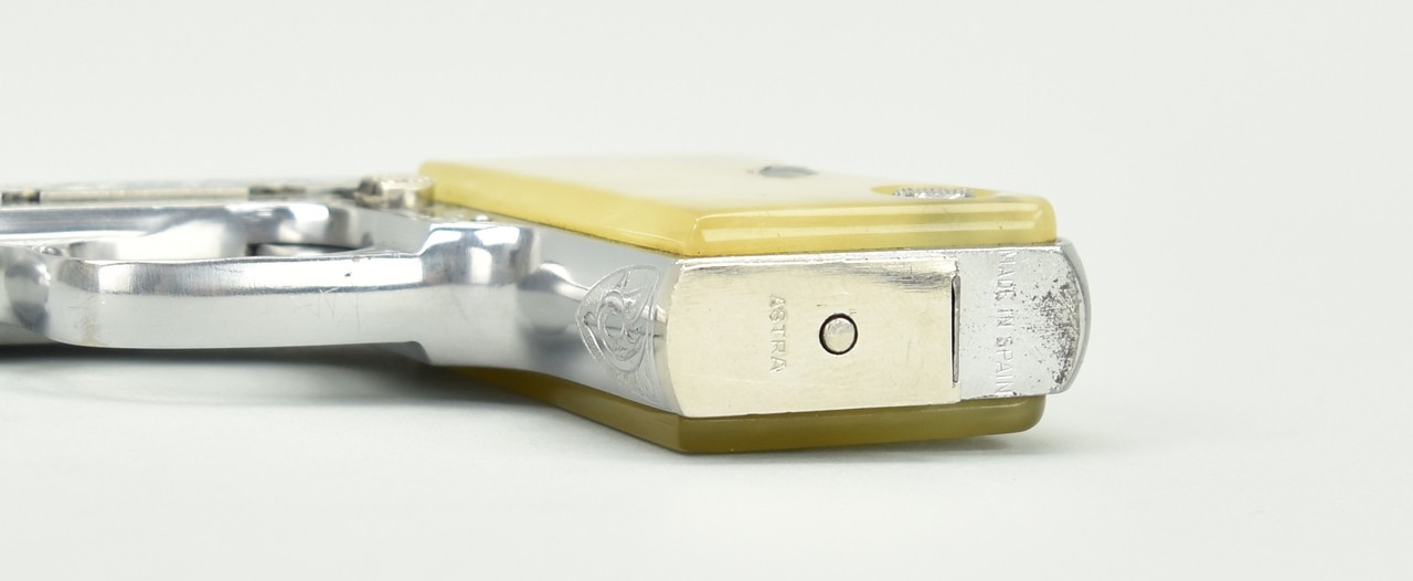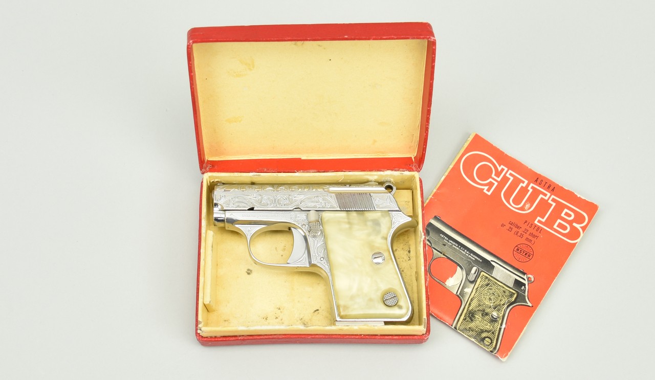 Astra Cub .22 Short caliber pistol. Factory engraved and chrome plated pocket pistol. Excellent condition with box.