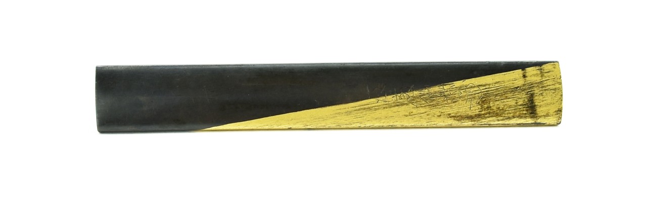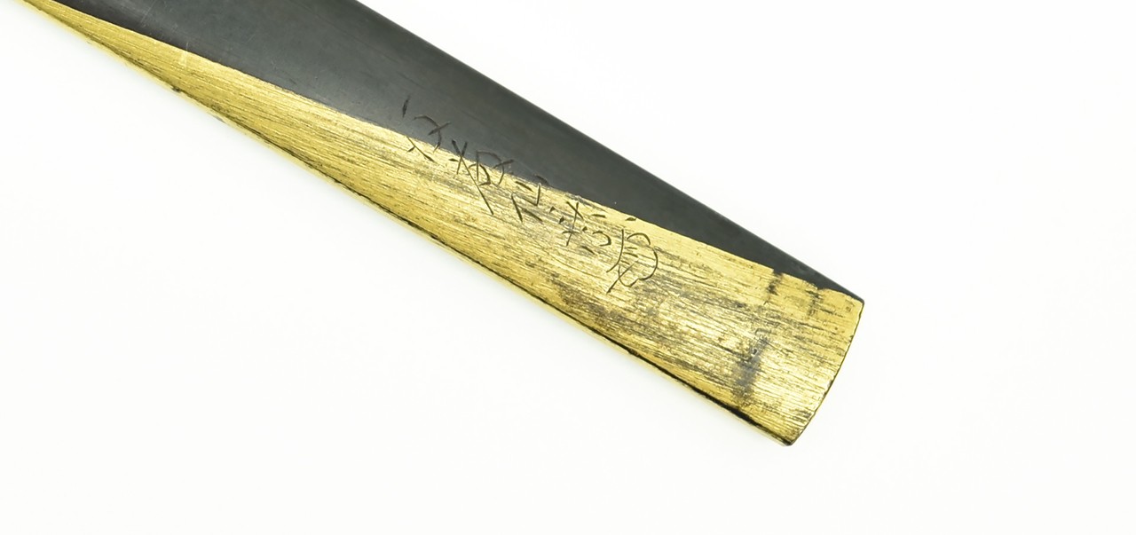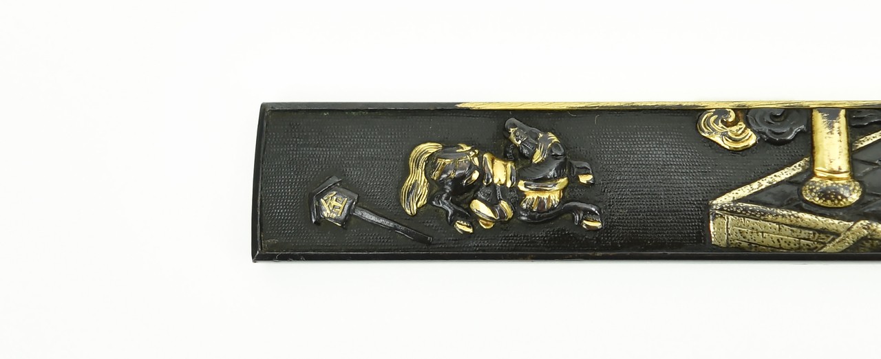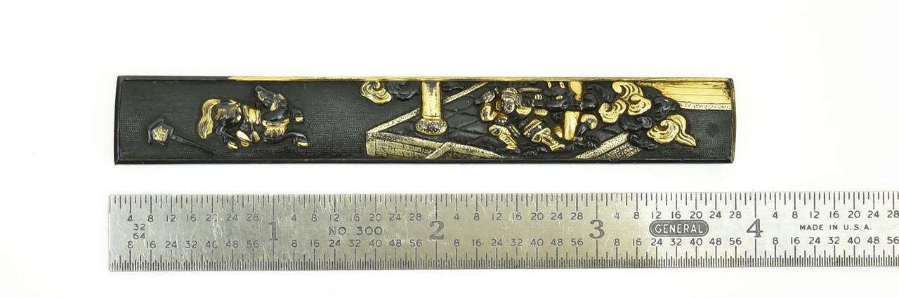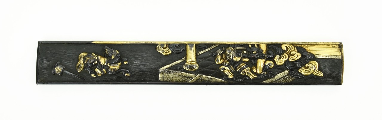 Kinko Kodzuka. Shakudo Nanako ground. Scene depicts a prancing Horse and a Samurai holding sword battling a Demon in swirling clouds. Signed: Goto with Kao.
