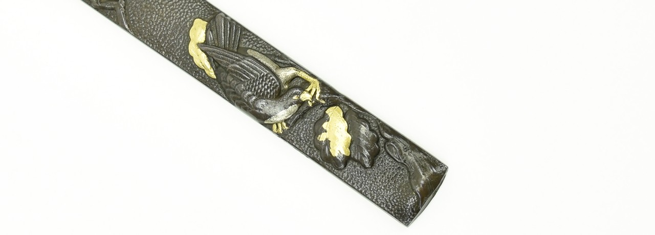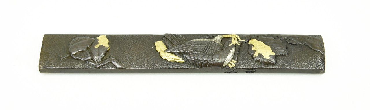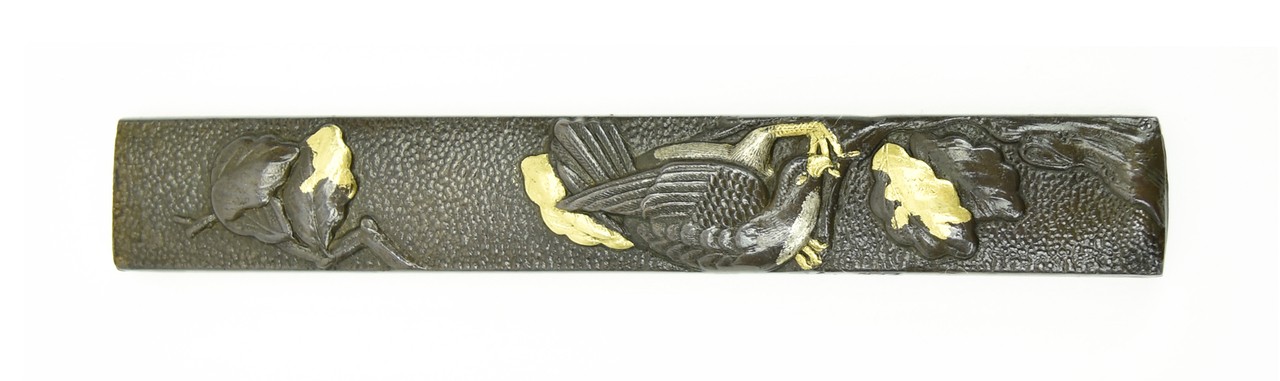 Kinko Kodzuka. Bird with foliage. Gold and silver highlights. Signed Haru Aki on side. (1789-1859). Pupil of Yanagawa Naoharu. Known as Shunai. Sosho Poem on reverse.