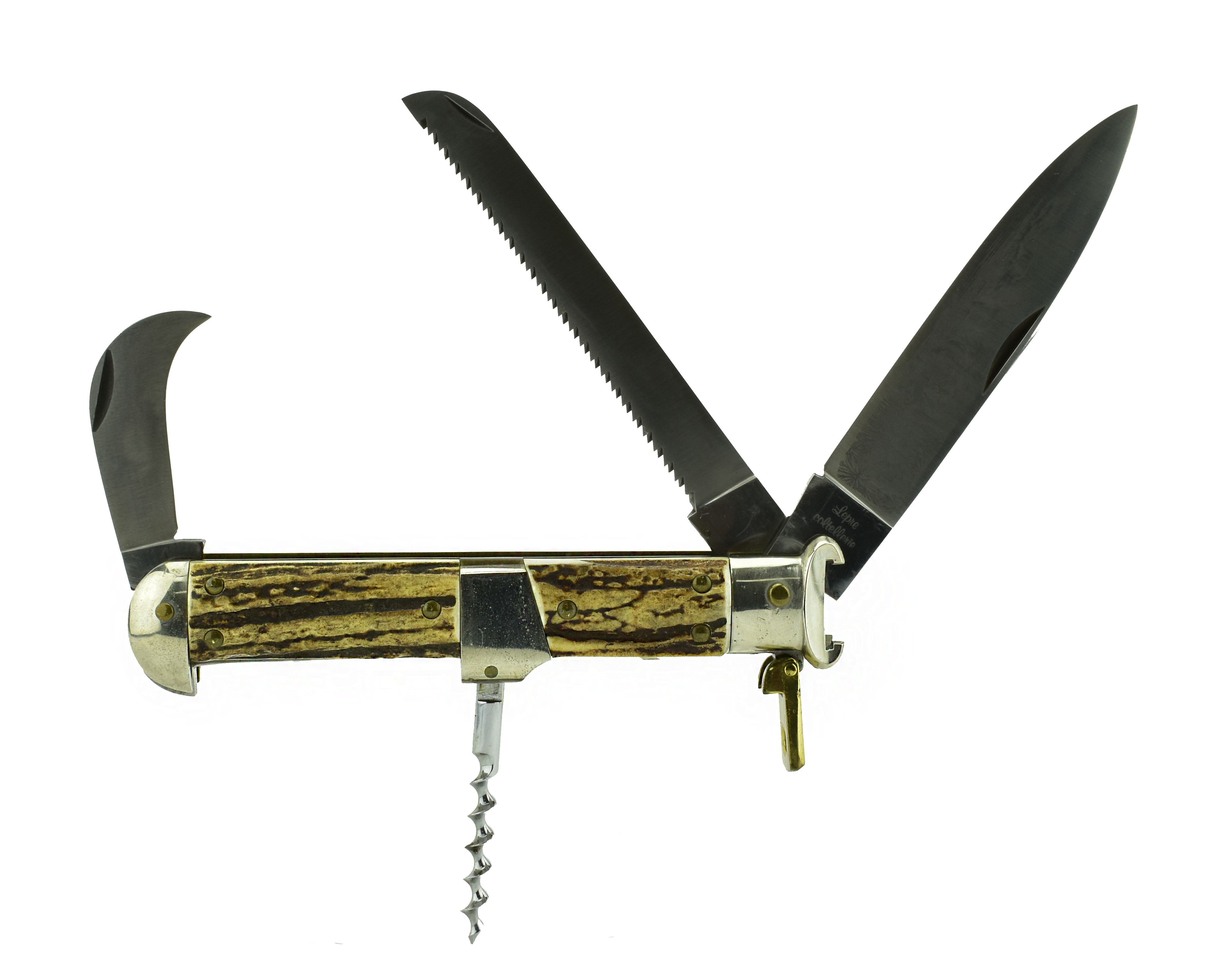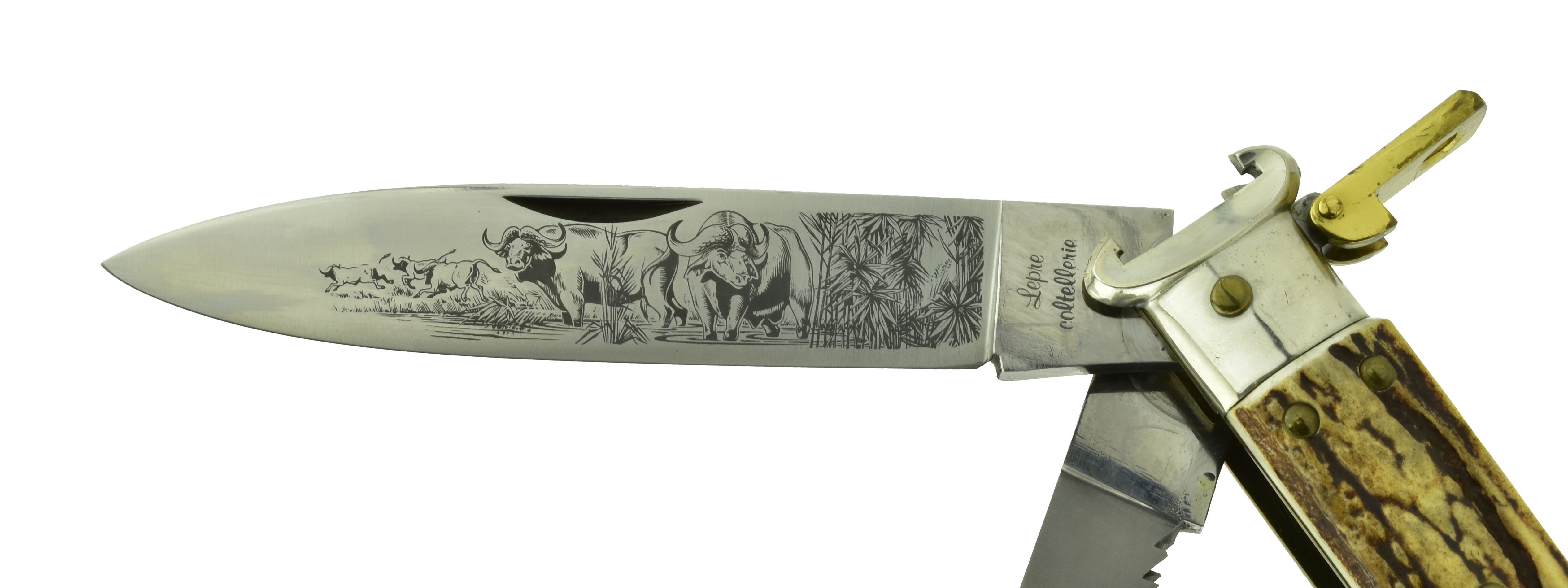 Large Italian made folding hunting knife with stag handles. Has a 4.5” drop point blade with etched game scene, and a small hook blade. The guard is made as a shotshell remover. Overall length closed is 6.75” and weight is 15 oz. A big and impressive beautiful piece