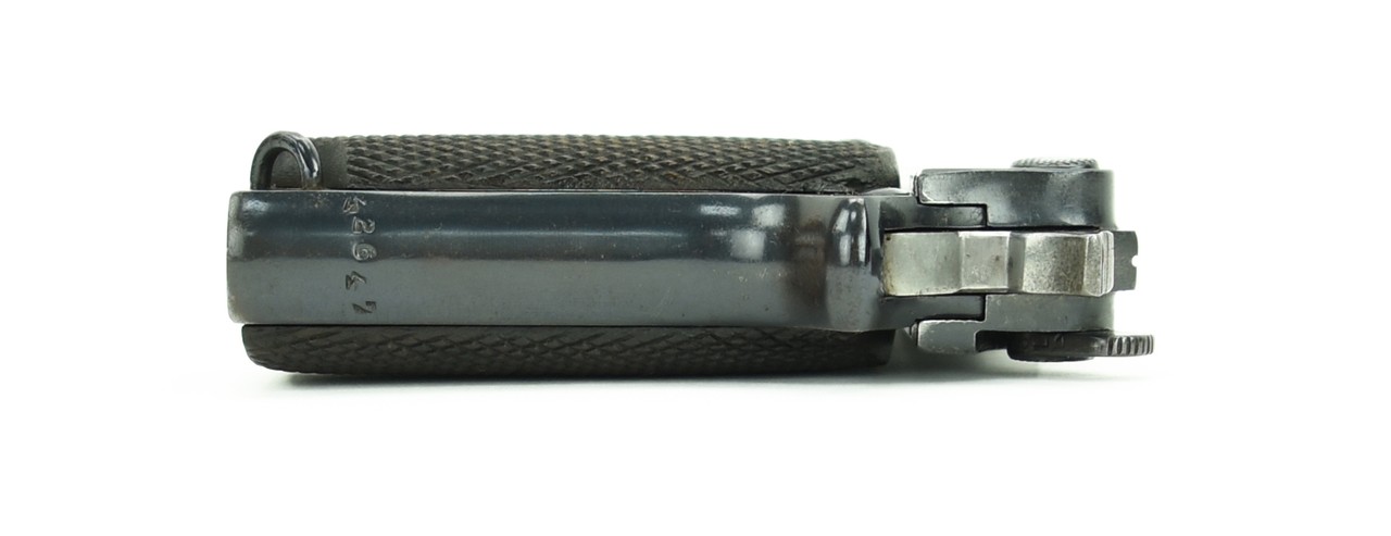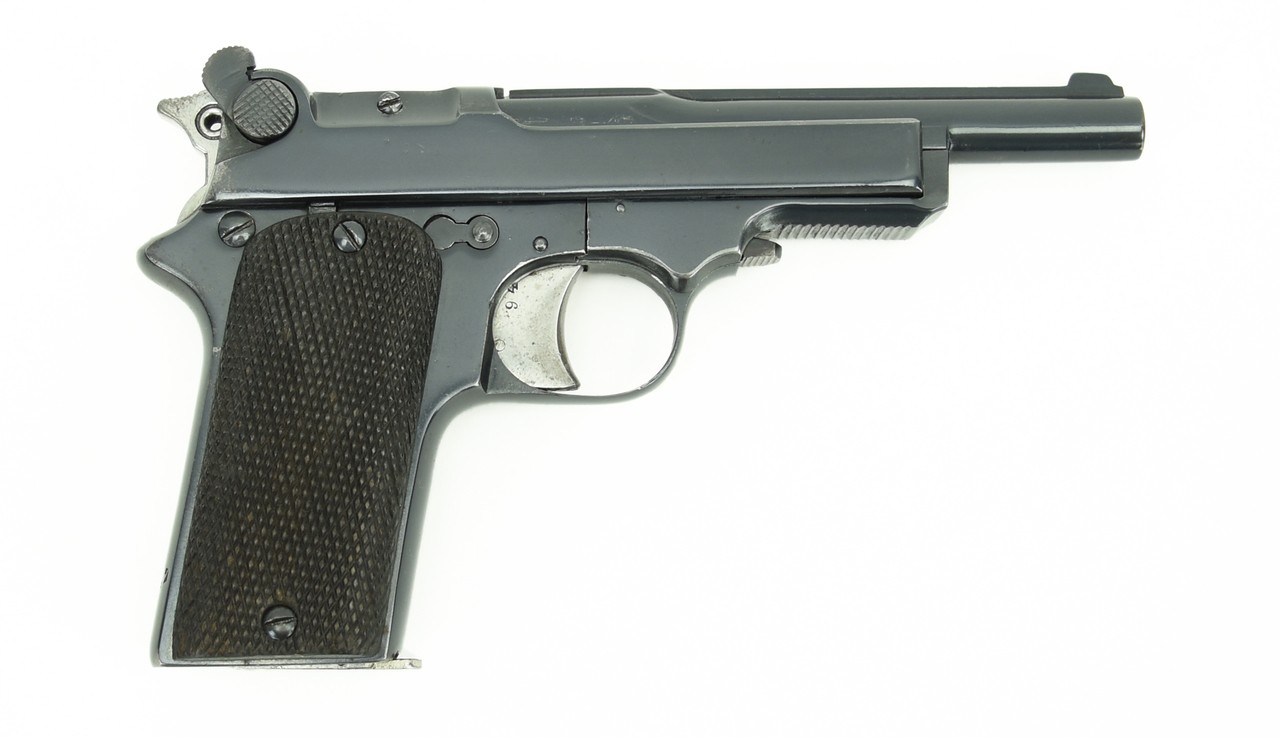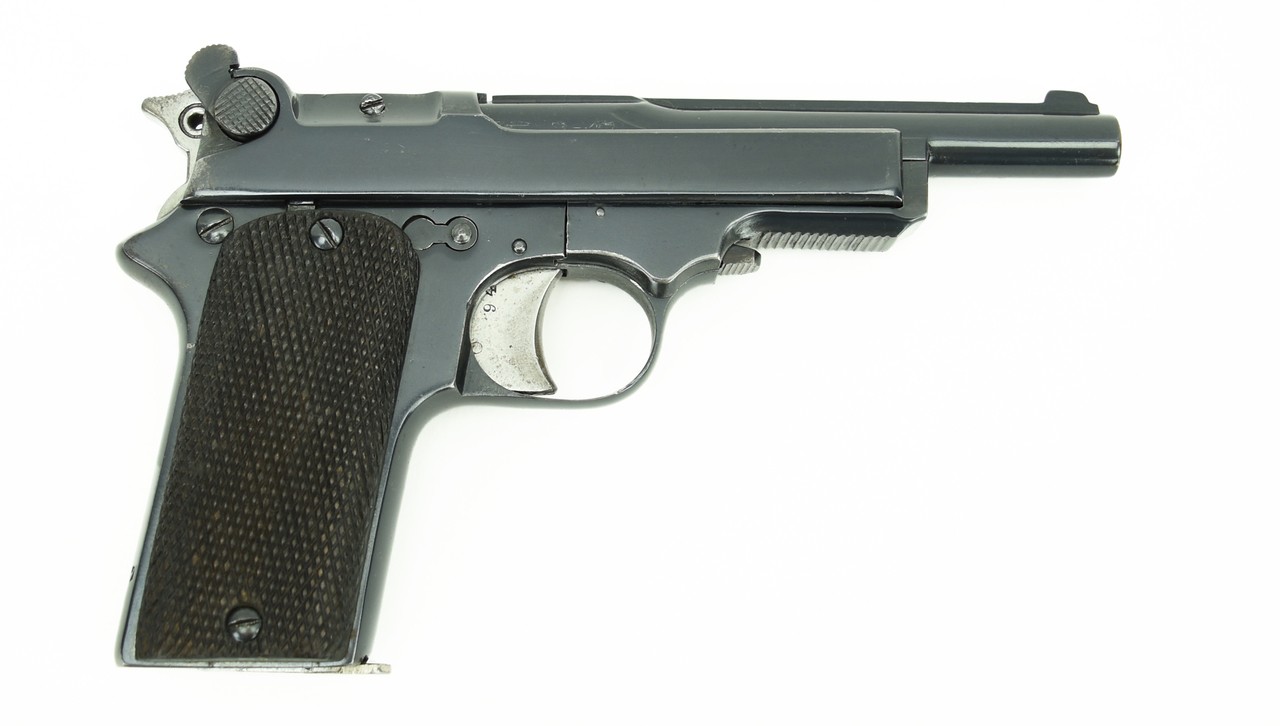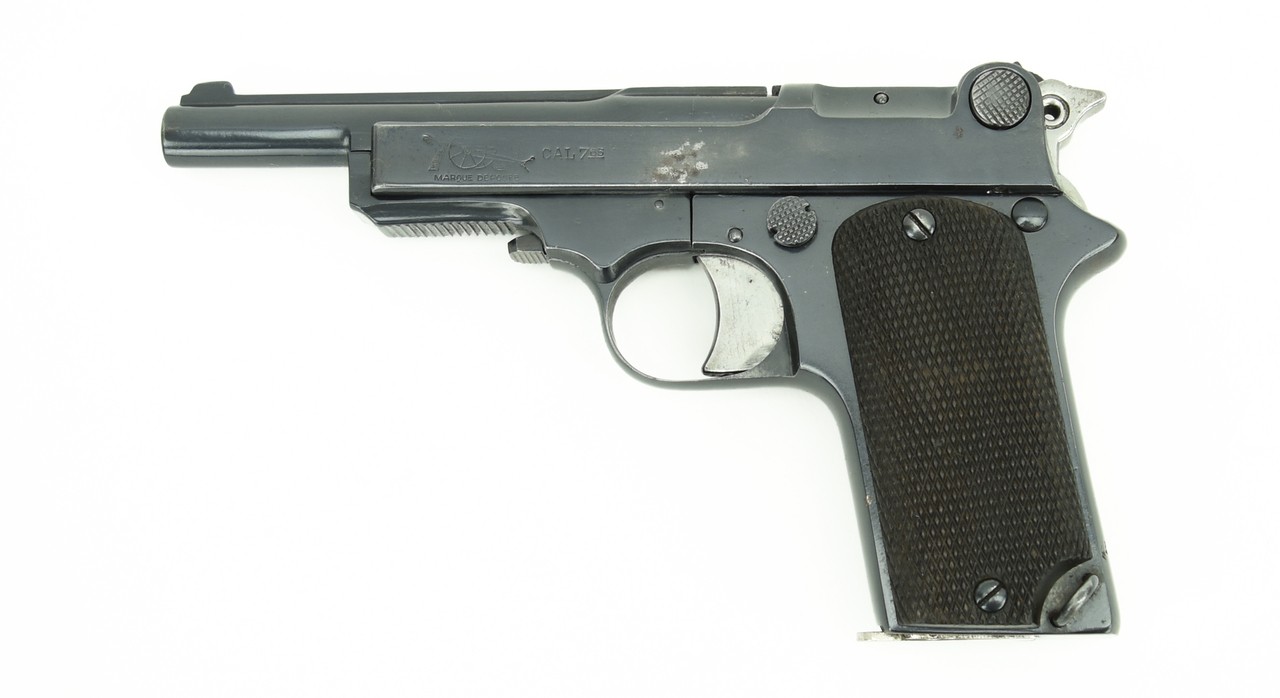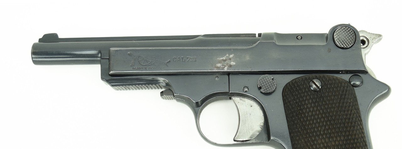 Star 1914 .32 ACP caliber pistol. Star produced approximately 20 000 of these pistols at the beginning of WWI and were sold to the French Military. The French were pleased to have the Star which they held in high regard as opposed to the Spanish Ruby pistol which they did not. Excellent bore. Hammer has a blocking safety for the firing pine. Grips are excellent. The gun is refinished and has 98-99% of the refinished blue. Left side of slide has a logo of a canon on a carriage with the “Marque Deposee” and 7.65 caliber mark. Hard to find and somewhat obscure Spanish made for the French Military WWI pistol.