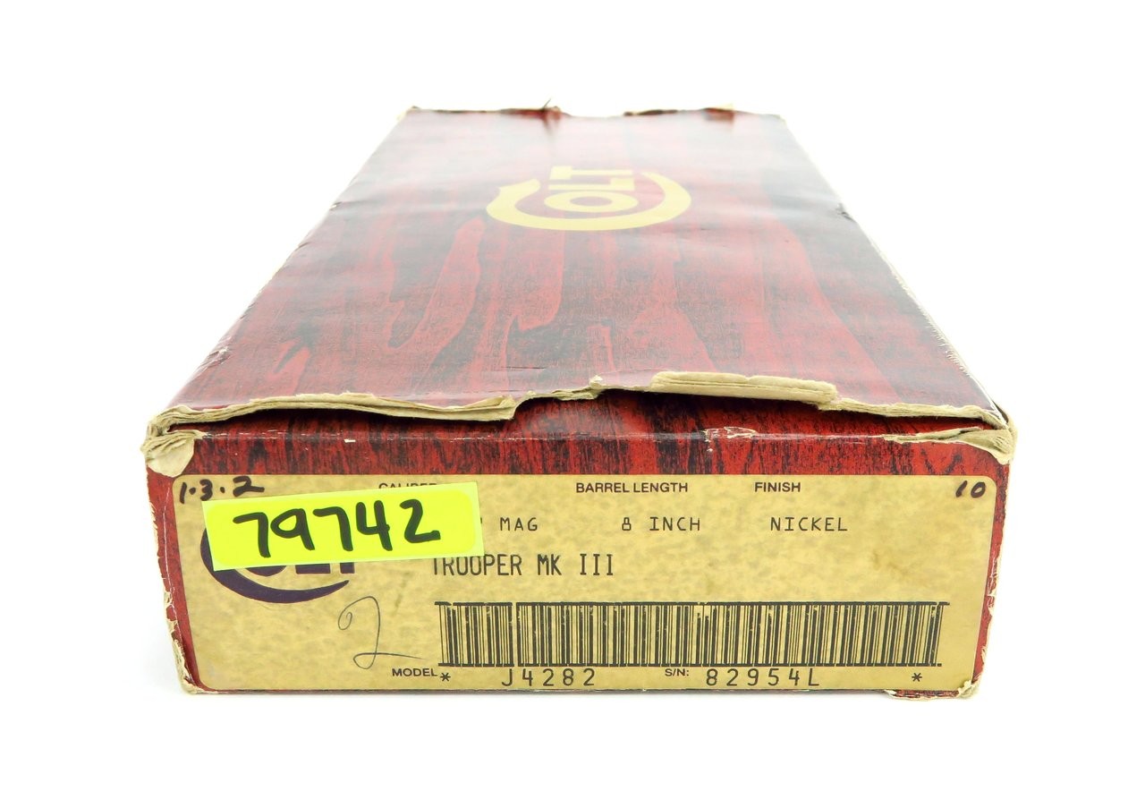 Colt Trooper MK III .357 Magnum caliber revolver. 8” nickel model made in 1981. Excellent condition with box.