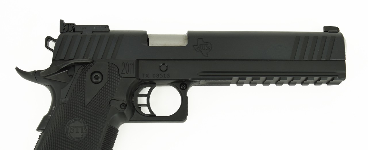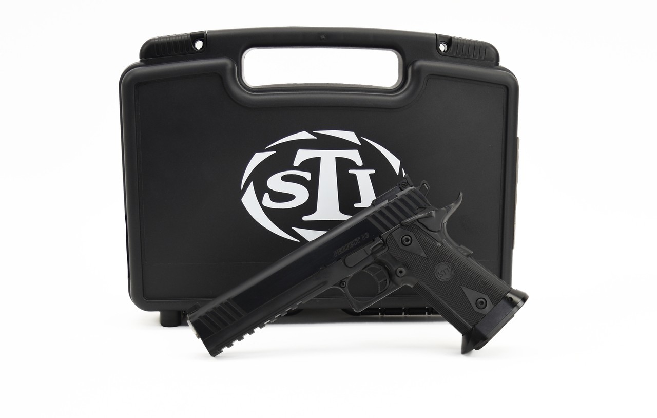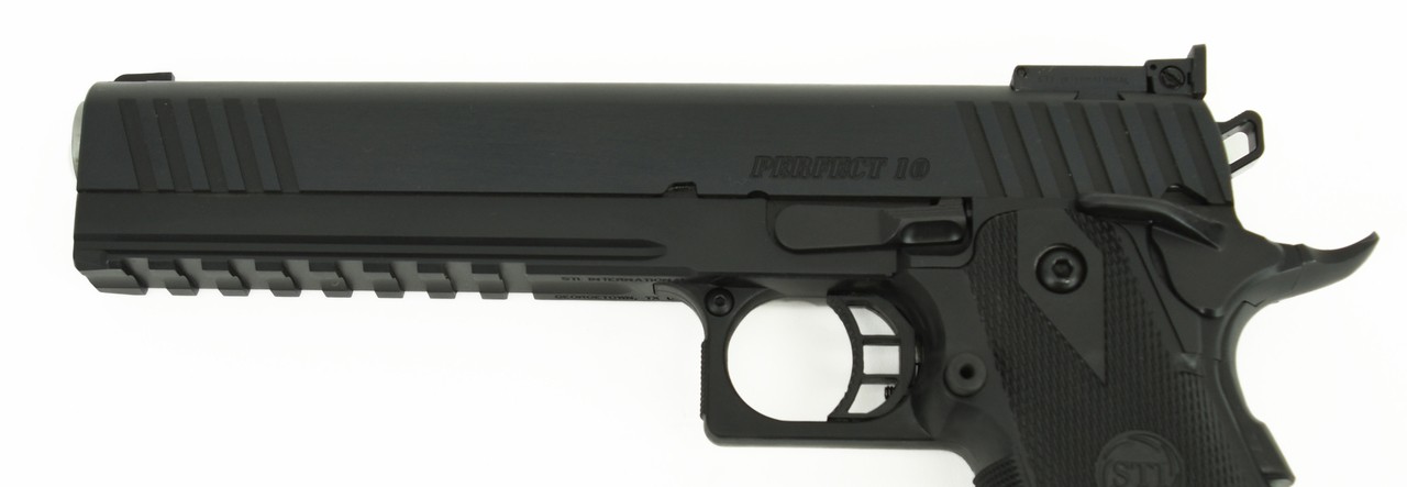 STI Perfect 10 10mm caliber pistol. Custom grade 6” 10mm long slide with rail and adjustable sights. New