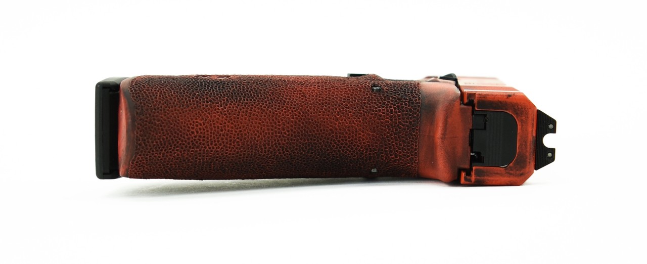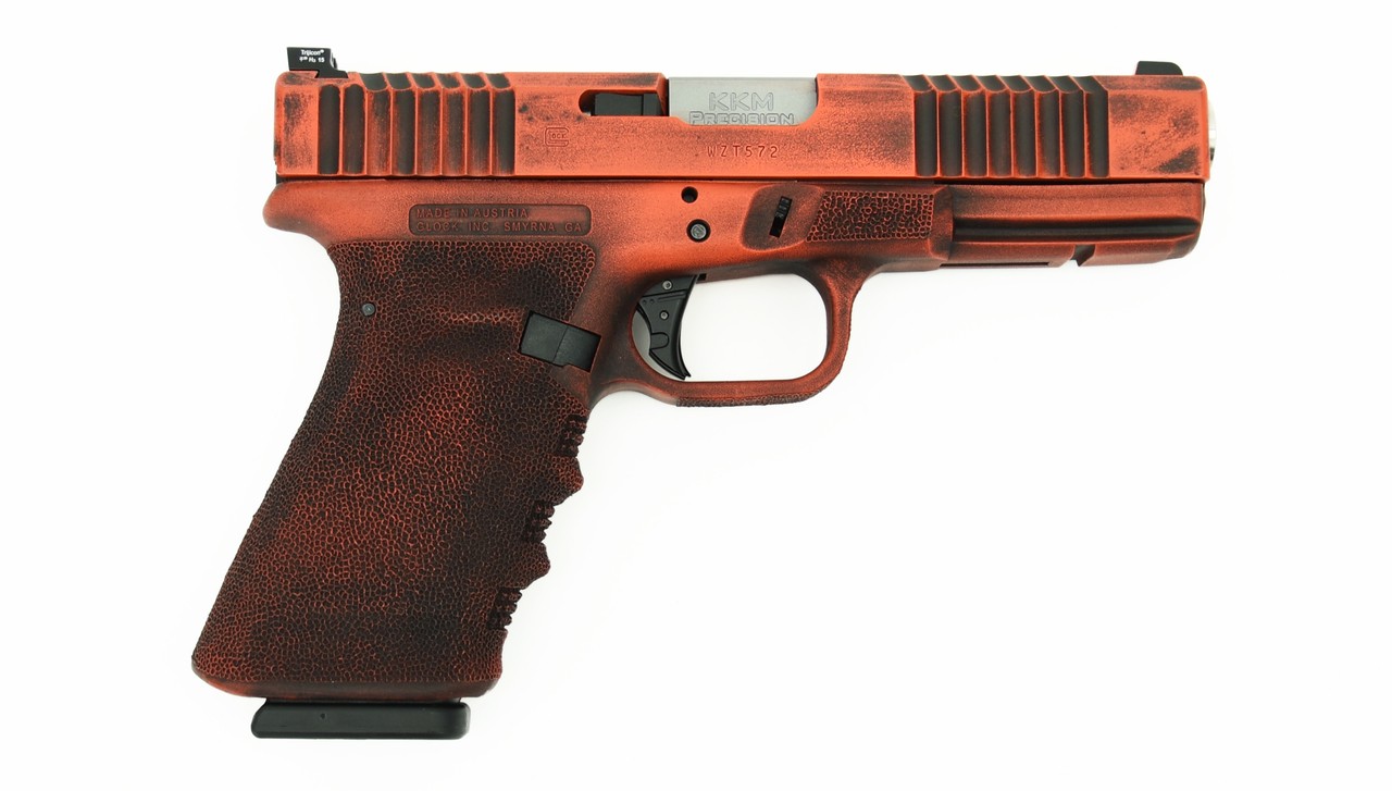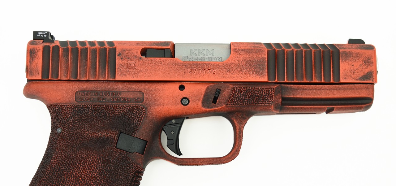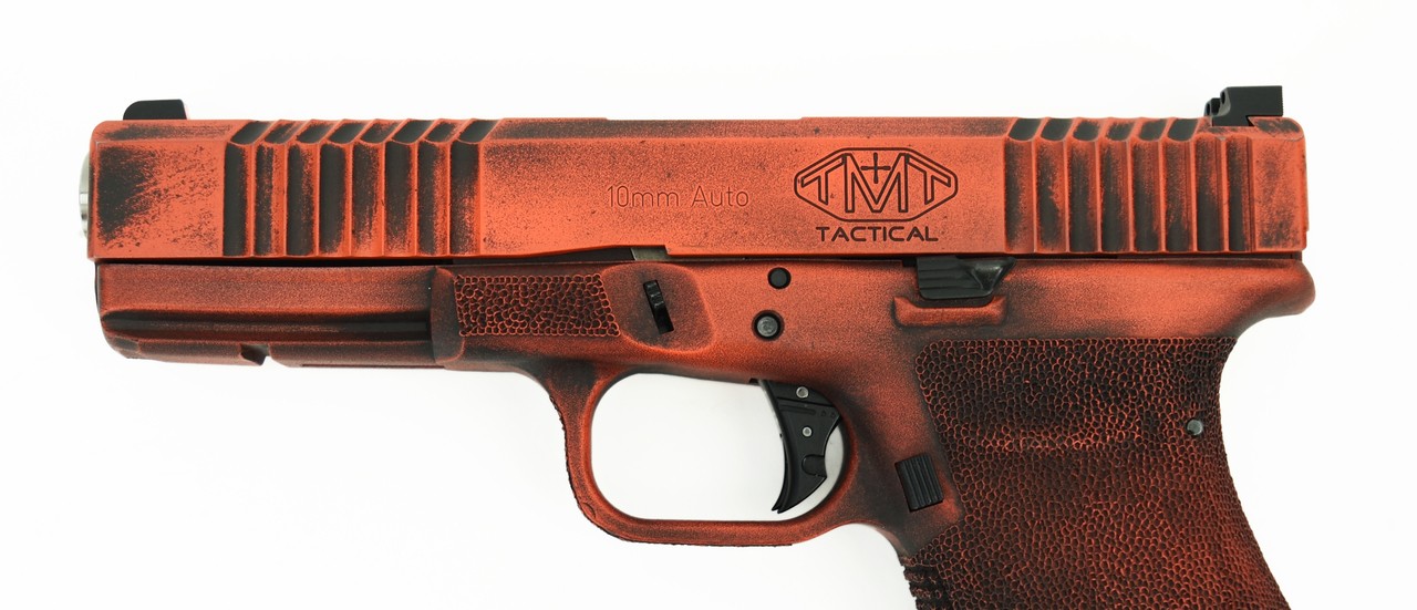 Glock 20 10mm caliber pistol. TMT Tactical customized Glock 20 with Orange War Torn finish, night sights, KKM barrel, upgraded trigger, and grip stippling in excellent condition.