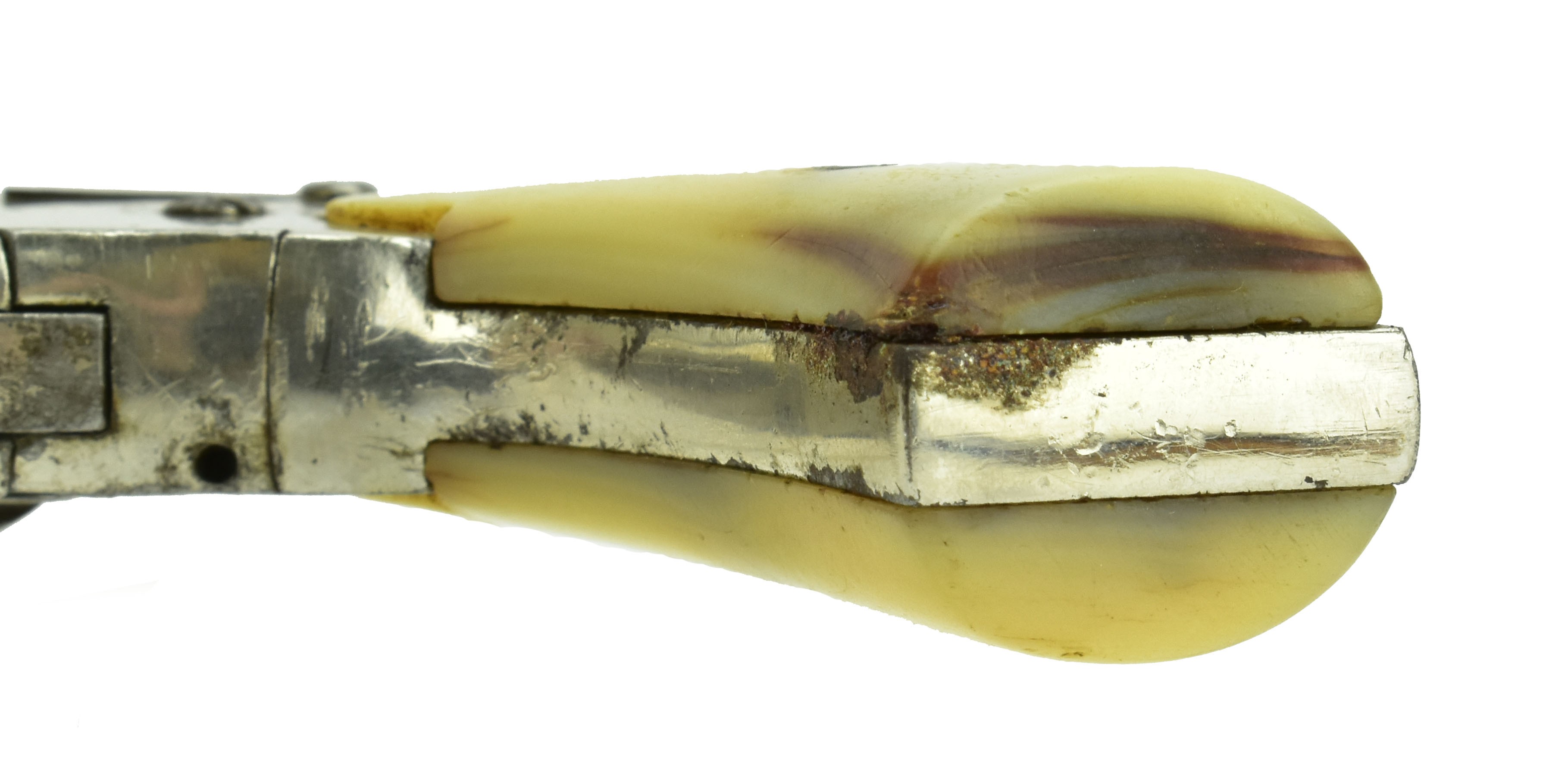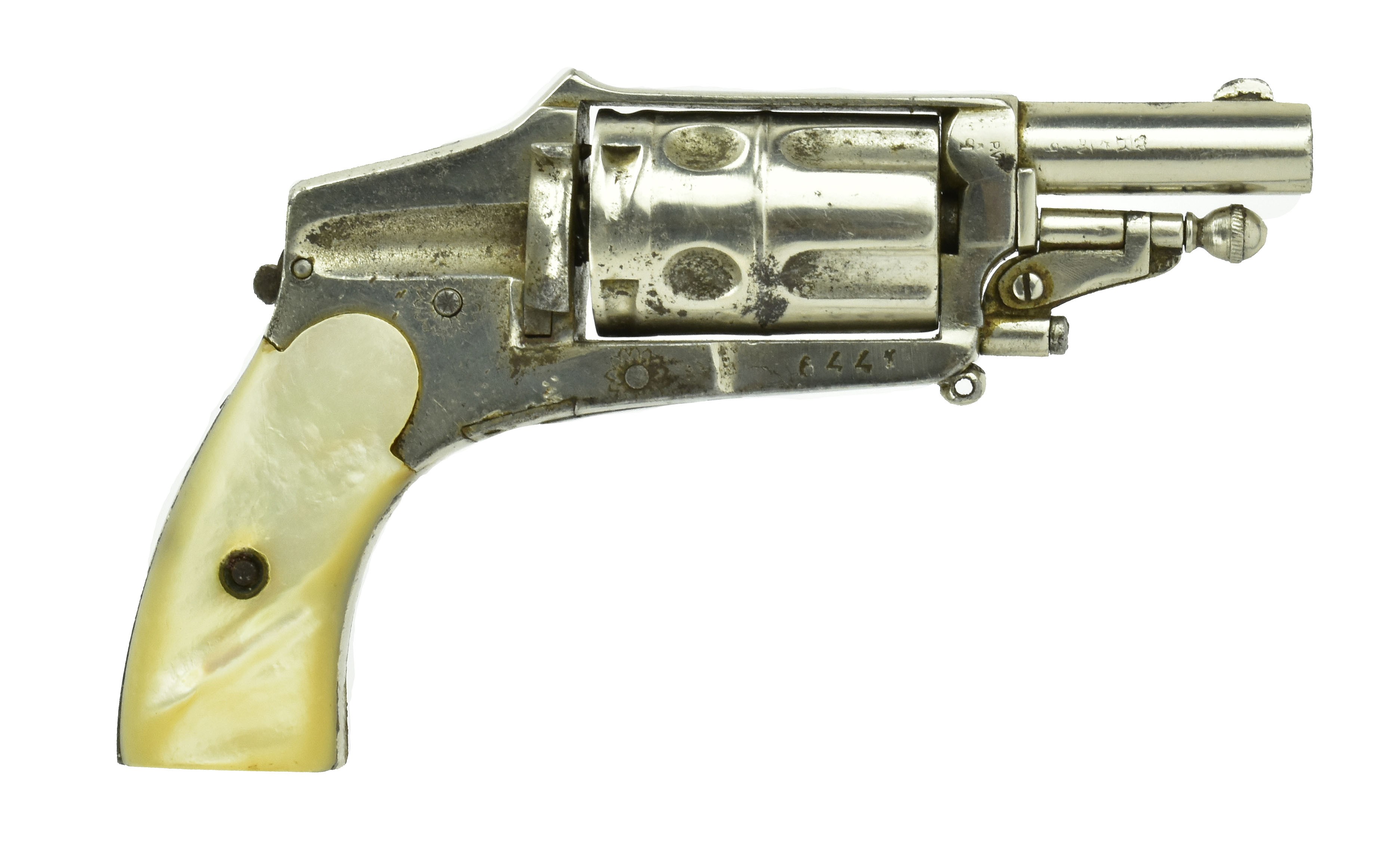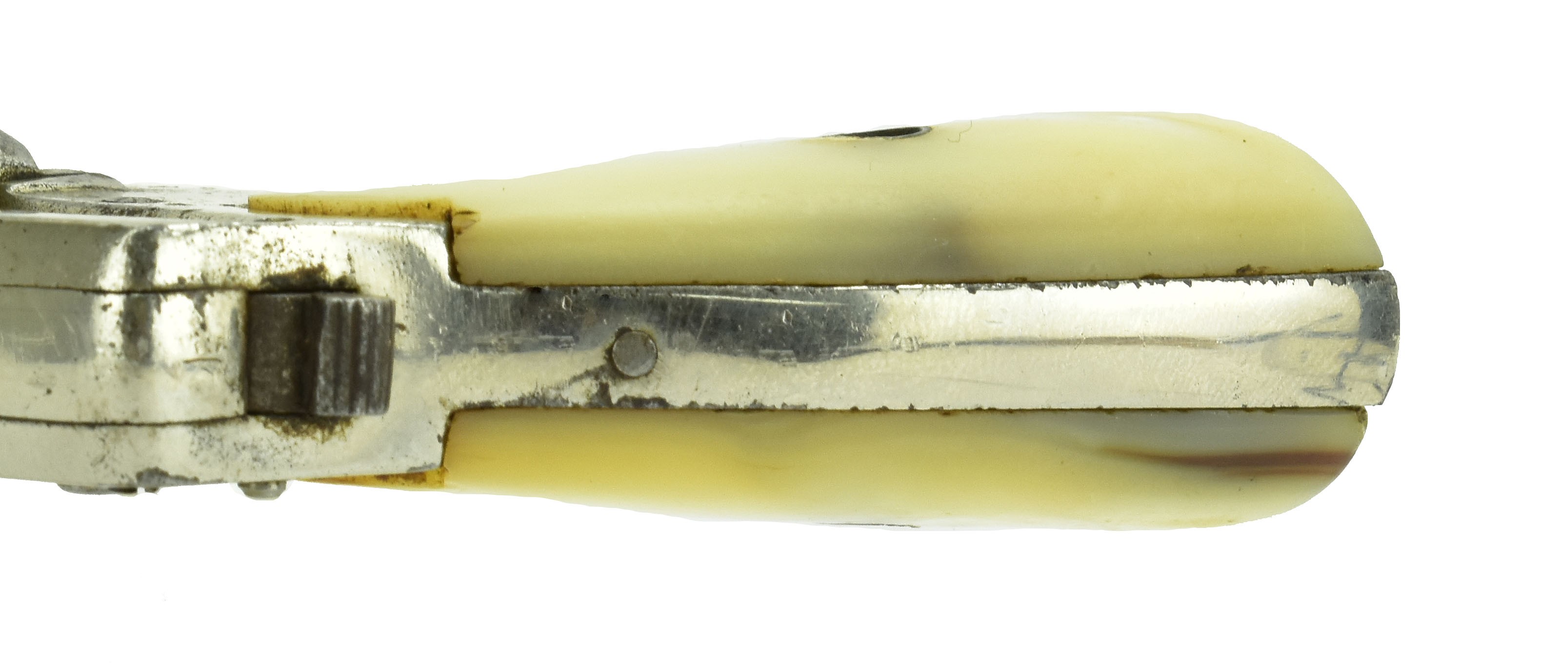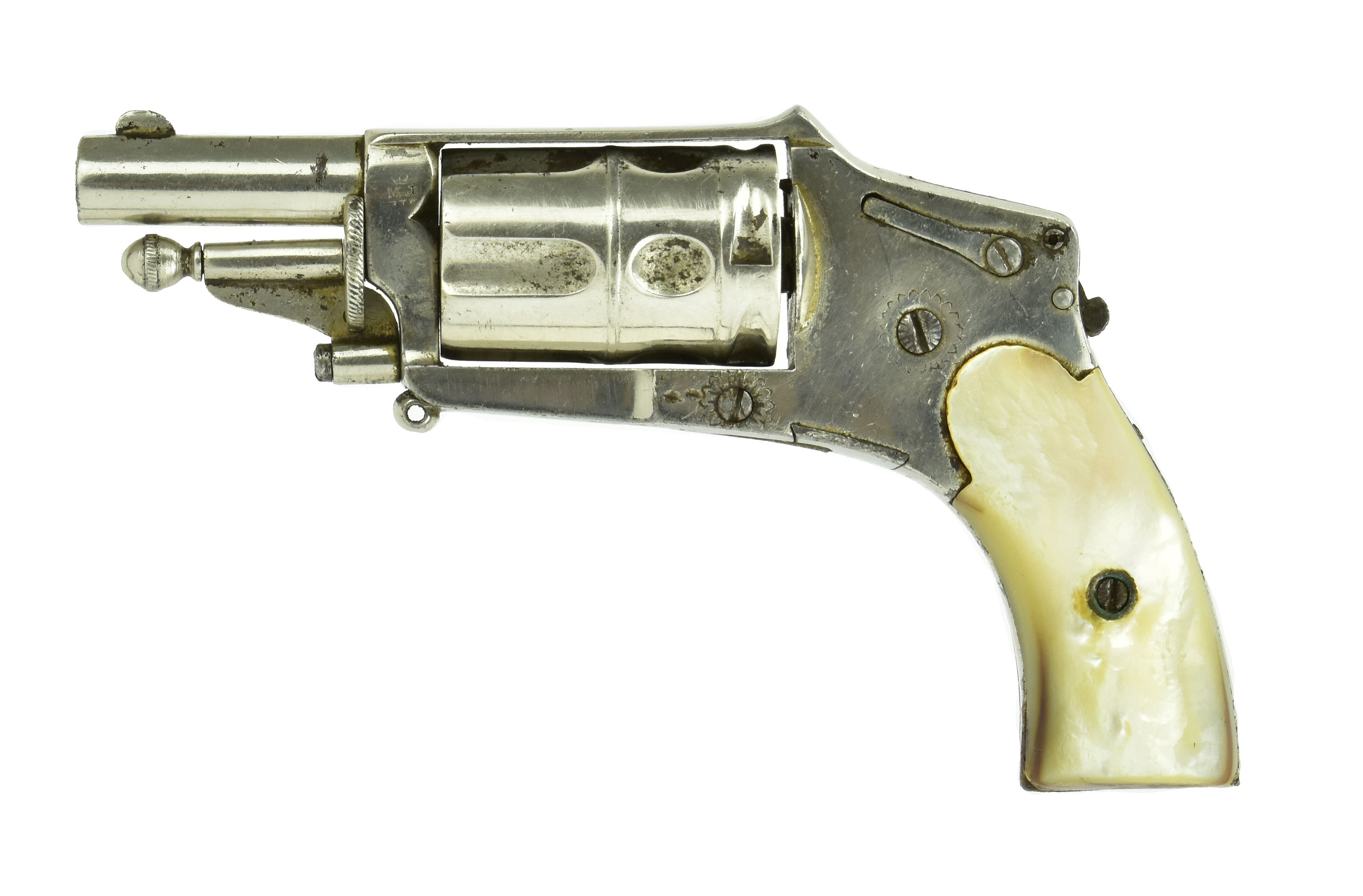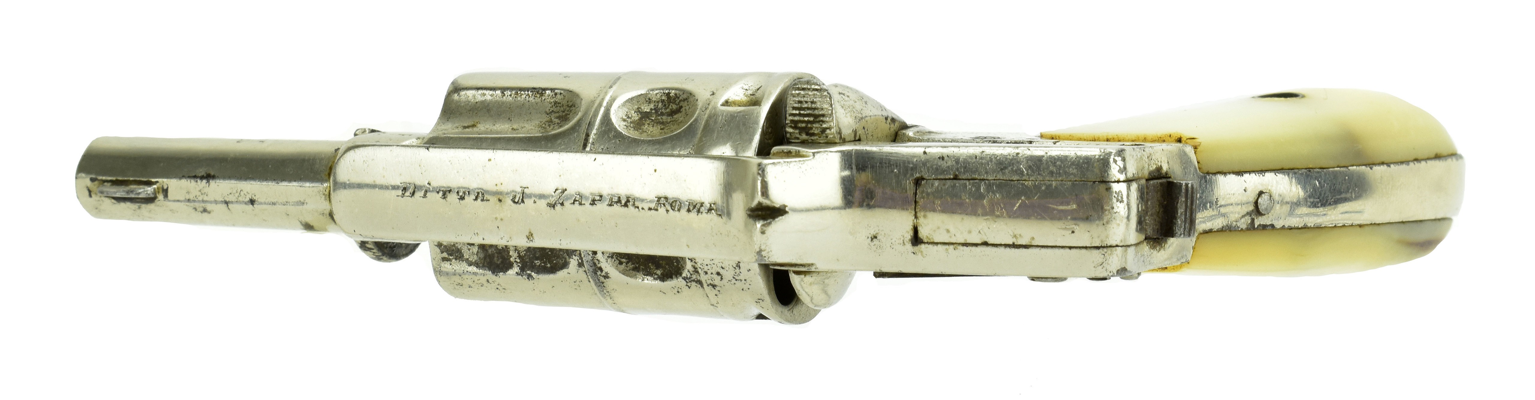 Belgian Velo Dog .22 caliber revolver. Folding trigger revolver. Original nickel finish has some minor areas of flaking. Mother of Pearl grips are very good, no cracks. Very good overall condition. Top strap is marked Ditta J.Kappa Roma.