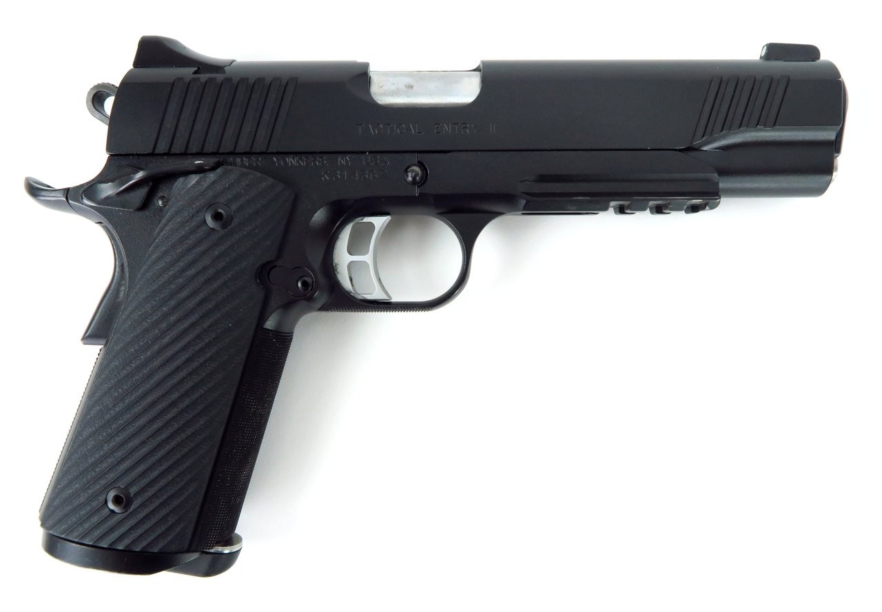 Kimber Tactical Entry II .45 ACP caliber pistol. Tactical model with rail, night sights, ambi safety, magwell, and G10 grips in very good condition.