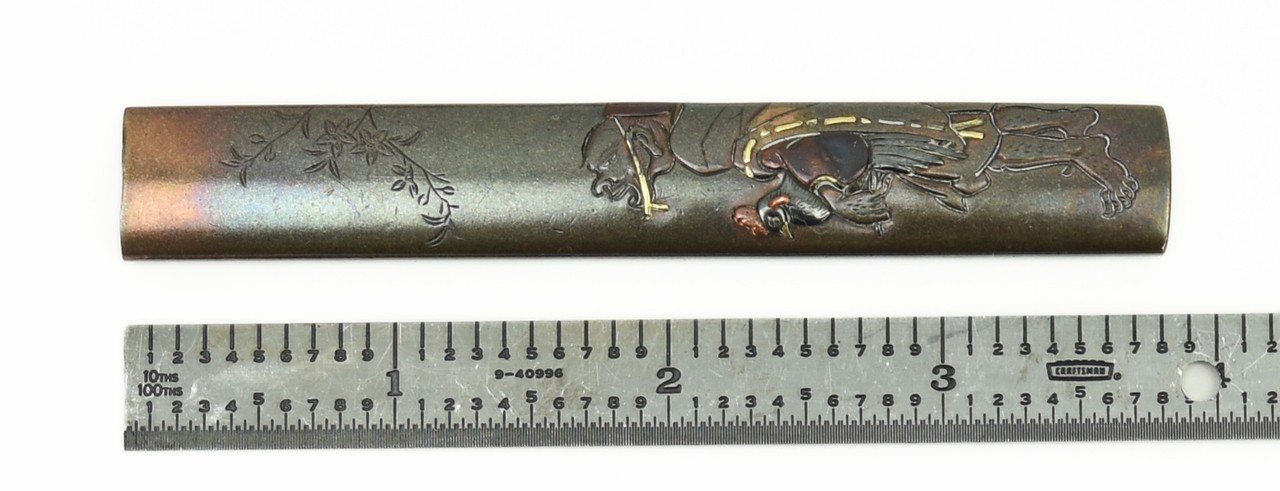 Kinko Kodzuka. Robed figure holding a rooster. Gold, shakudo, and red highlights. Reverse has two roosters. Signed: Moto Nori (kao), pupil of Moto Zane II. Middle 19th Century. Worked in Mito of the Oyama family.