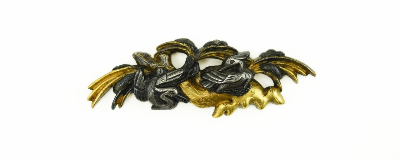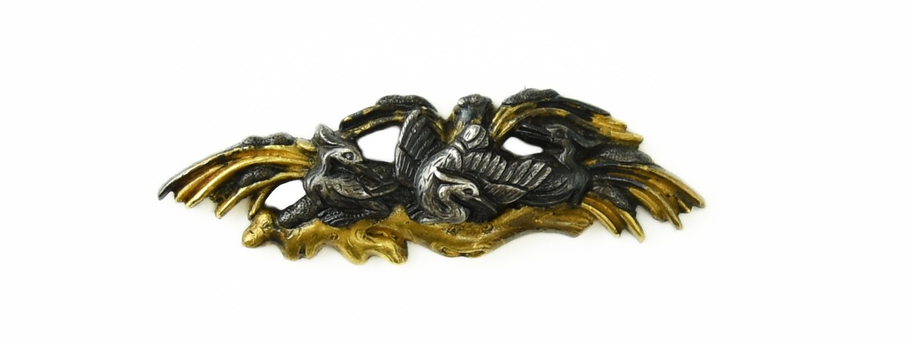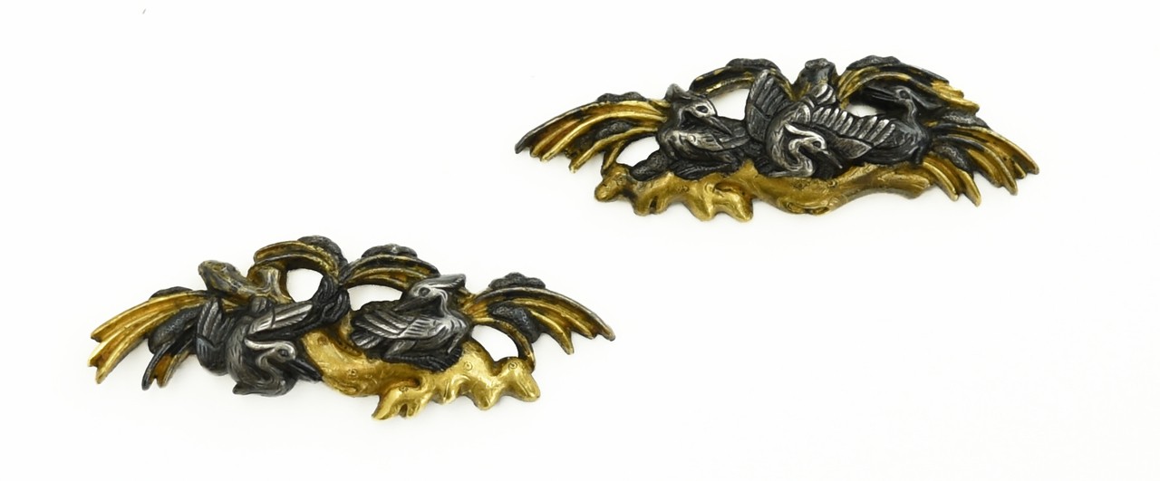 Kinko Menuki. Motif of shakudo birds sitting in golden nest with shakudo branches. Unsigned. Comes with N.B.T.H.K. certificate, attributing these Menuki to Shokatei Moto Hiro. Circa 1800. Lived in Kyoto.