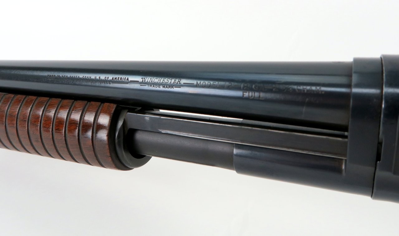 Winchester 12 12 Gauge shotgun. Manufactured in 1951 with 30” full choke barrel. Matching serial numbers. About 99% bluing. LOP is 13¾” over an aftermarket recoil pad. Wood is very good with minor dents and dings, no cracks. Very good condition overall.