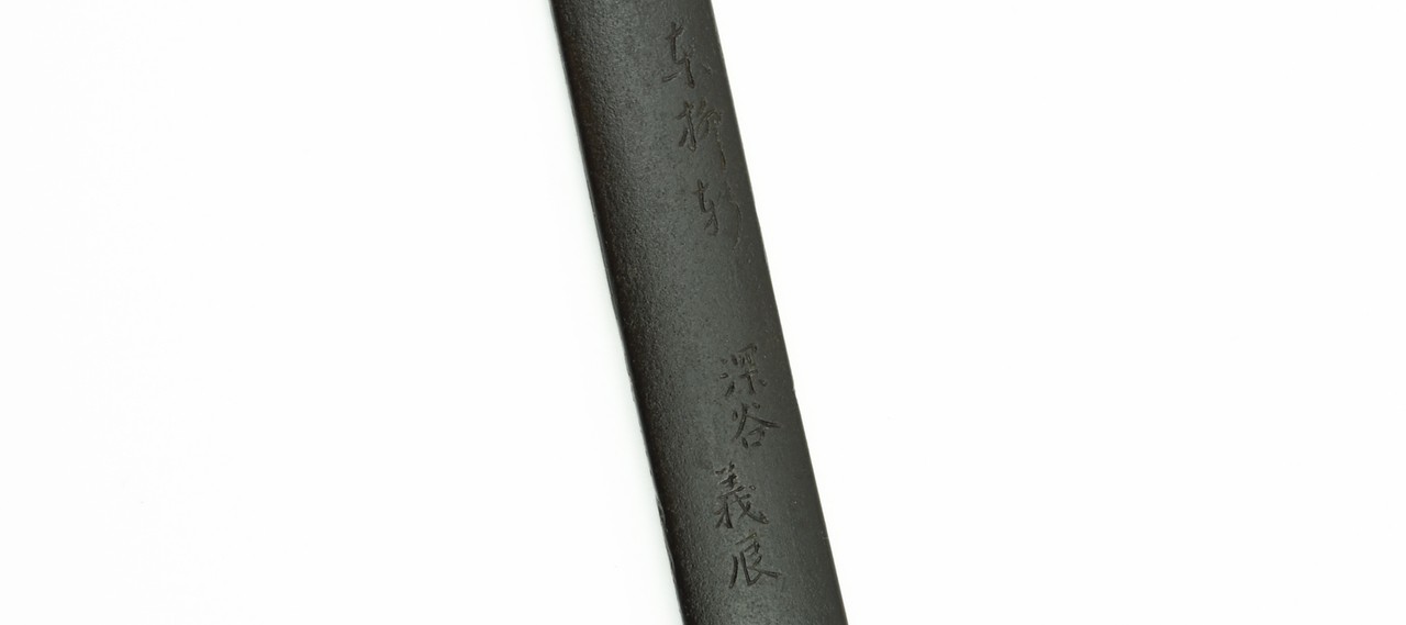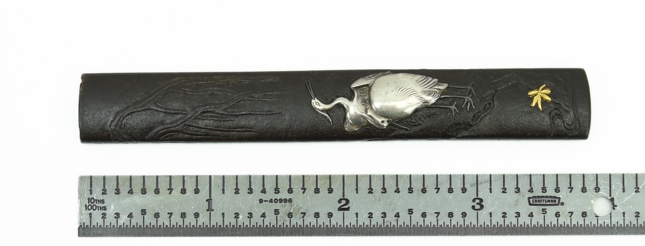Iron Kodzuka. Two silver cranes standing on rocky outcrop under a weeping willow gold foliage at base. Signed.