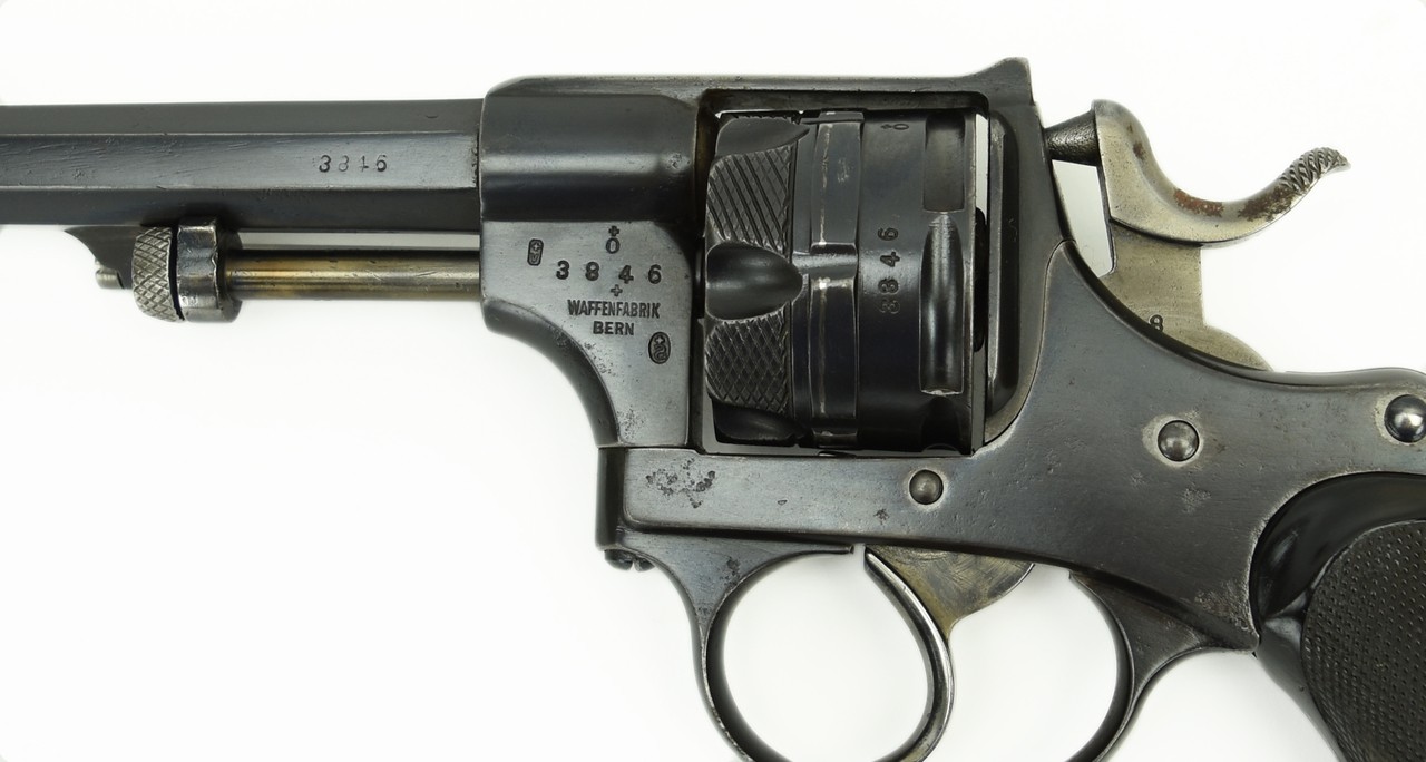 Swiss Model 1878 10.4mm Centerfire caliber revolver. This is the Warwant system design. Manufactured by Waffenfabrik Bern. Bore is very good. Action works perfectly. Grips are excellent. Gun has 98% factory refinish (arsenal refinish) as are a great many Swiss guns. Very well made example!