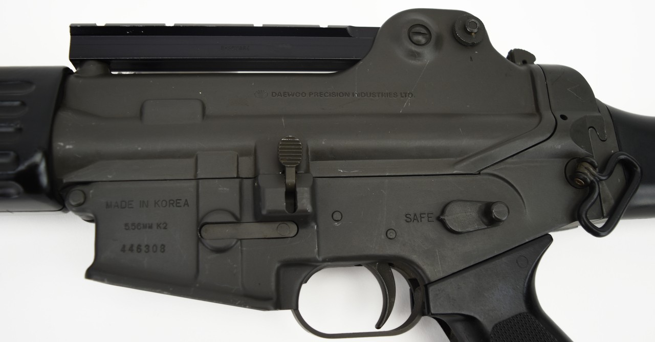 Daewoo K2 5.56mm caliber rifle. A Korean styled AR with side folding stock. Comes with one magazine. In great condition.