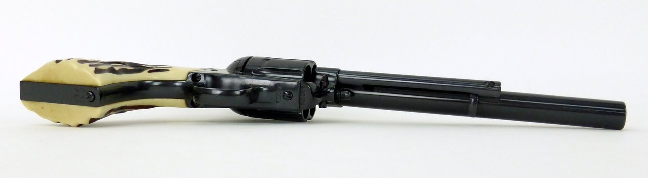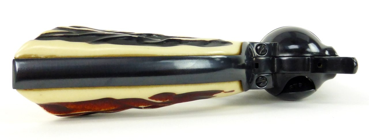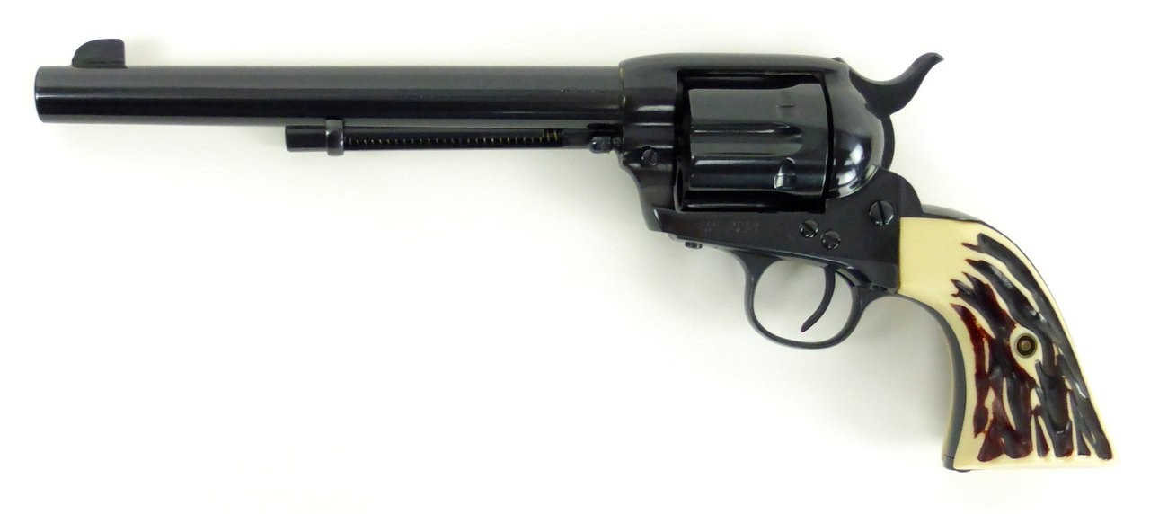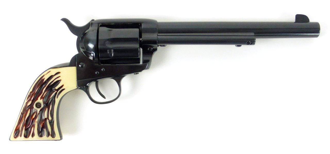 Colt Single Action Army .45 LC caliber revolver. Made in 1915. 7½” barrel in .45 LC. Metal has been refinished. Grips are replacements made to look like stag. Bore is bright and shiny. Nice looking gun!