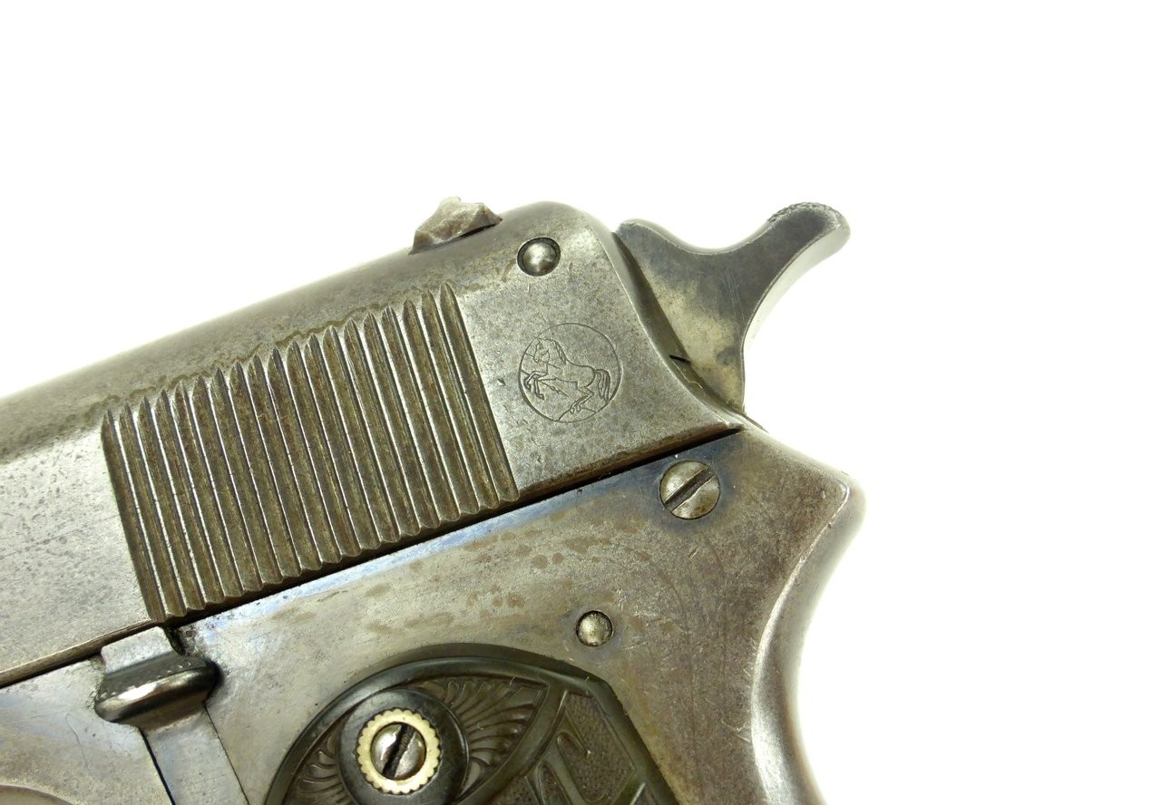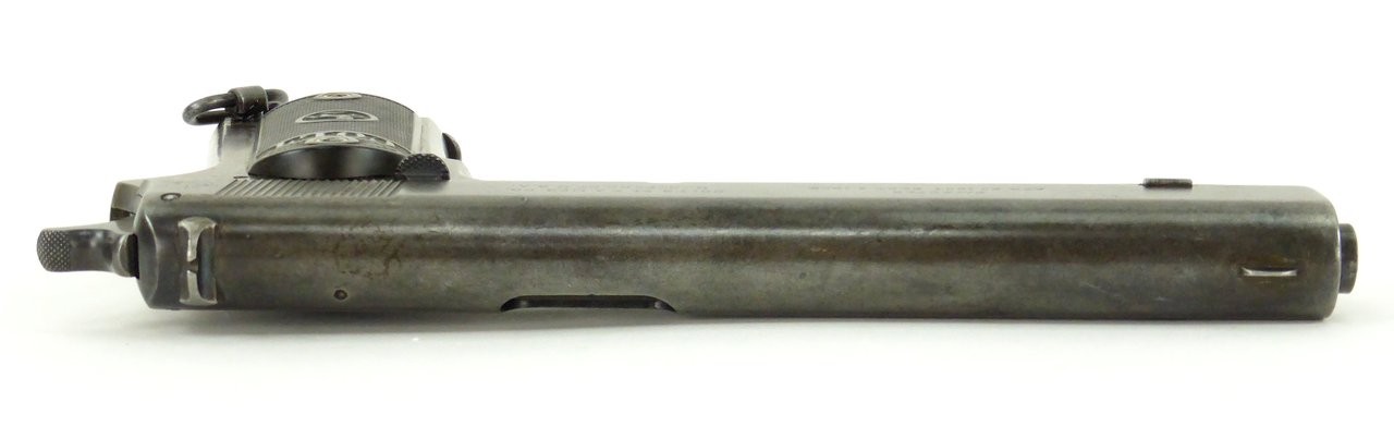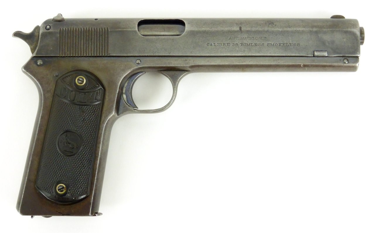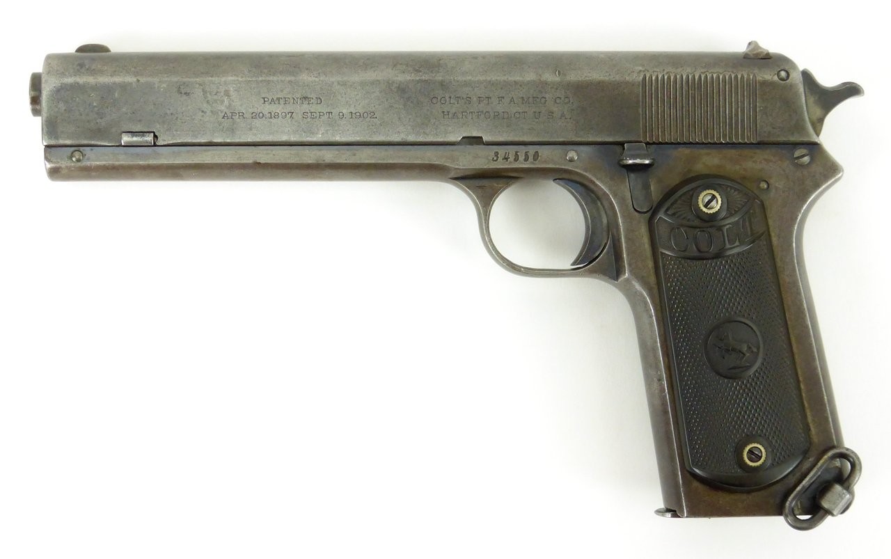 Colt 1902 Military .38 Auto caliber pistol. Manufactured in 1912. Bore has strong rifling and has frosting throughout. Metal has a gray-brown patina. Grips are good with some wear. Good overall condition.