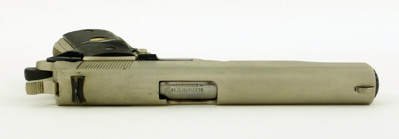 Colt Government .45 ACP caliber pistol. Series 70 Model with factory 2-tone finish. Has satin nickel frame and slide with blued small parts and Colt rubber grips. Shows some carry wear, overall very good condition.