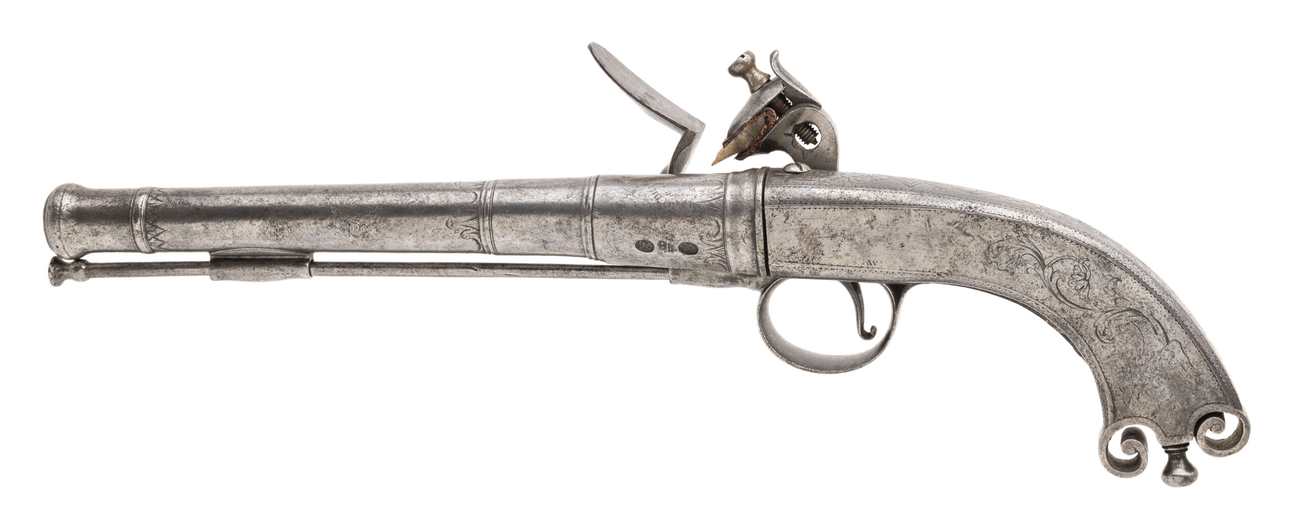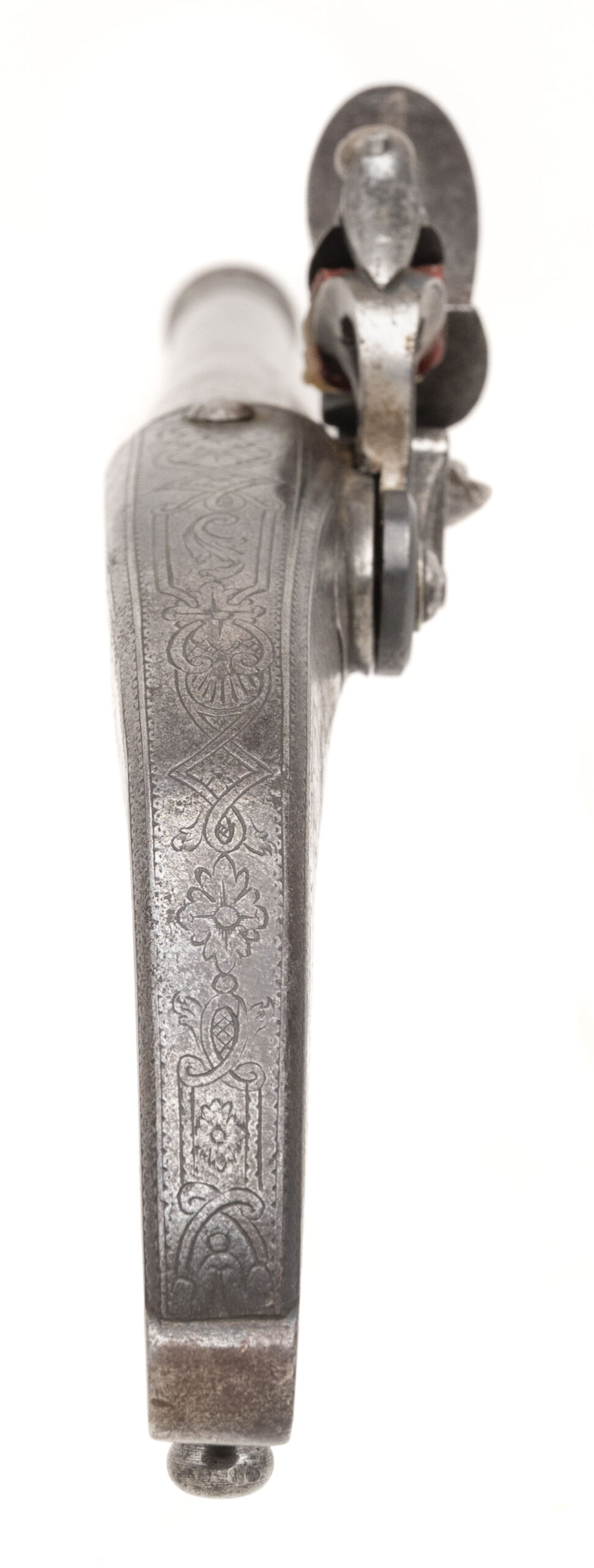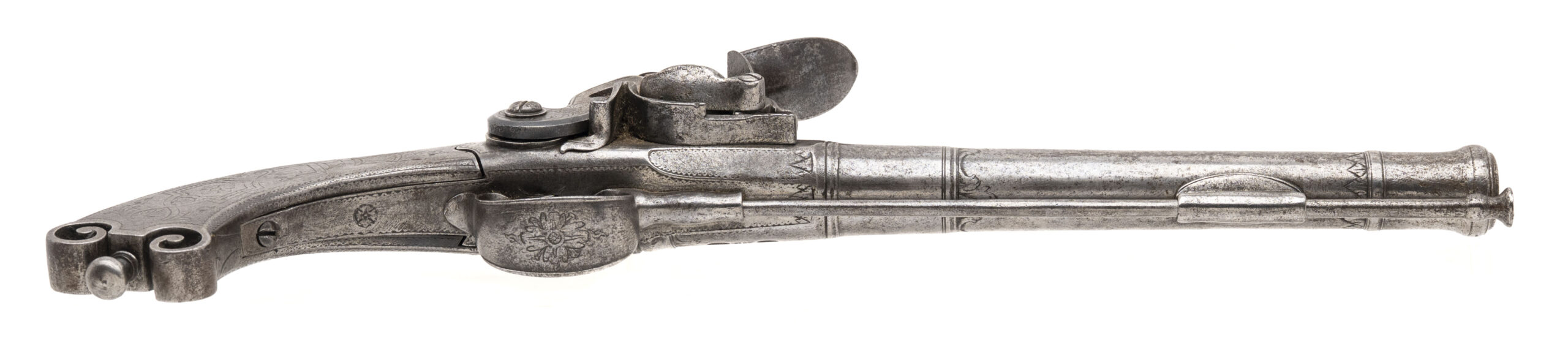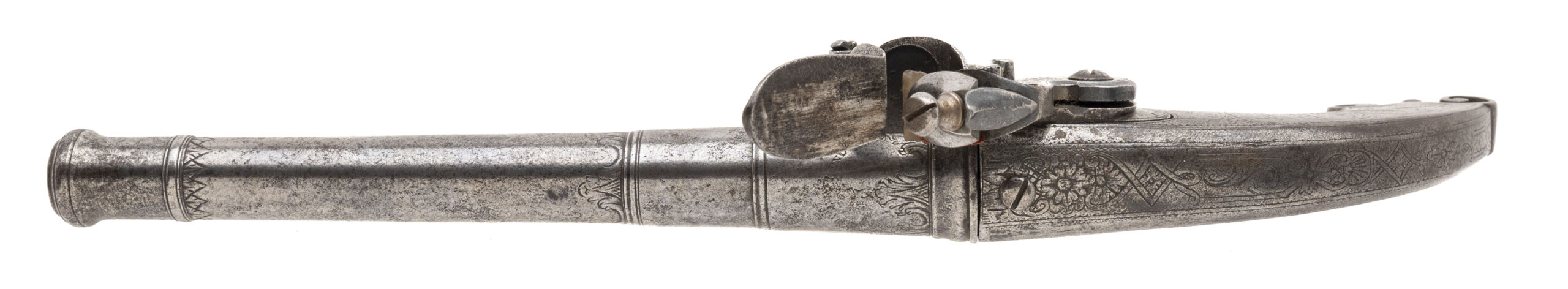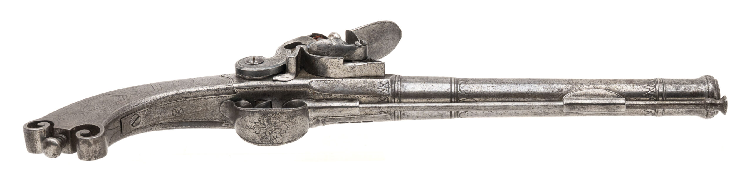 Pair of Scottish Flintlock Pistols by W. Brander. Unusual pair of London Made Scottish style pistols by W. Brander. These are classic Scottish style all metal guns. Barrels are 8” and total length are 13 ½”. The only deviation from the classic Scottish style of these guns is the Inverted V spring style lock. William Brander was a London gunsmith from 1752-1789. Along with this gun comes a binder that has different examples of guns that he made. None that we found were in the Scottish style. All of his guns are of excellent quality and the Metropolitan Museum of Art has a pair in their collection.