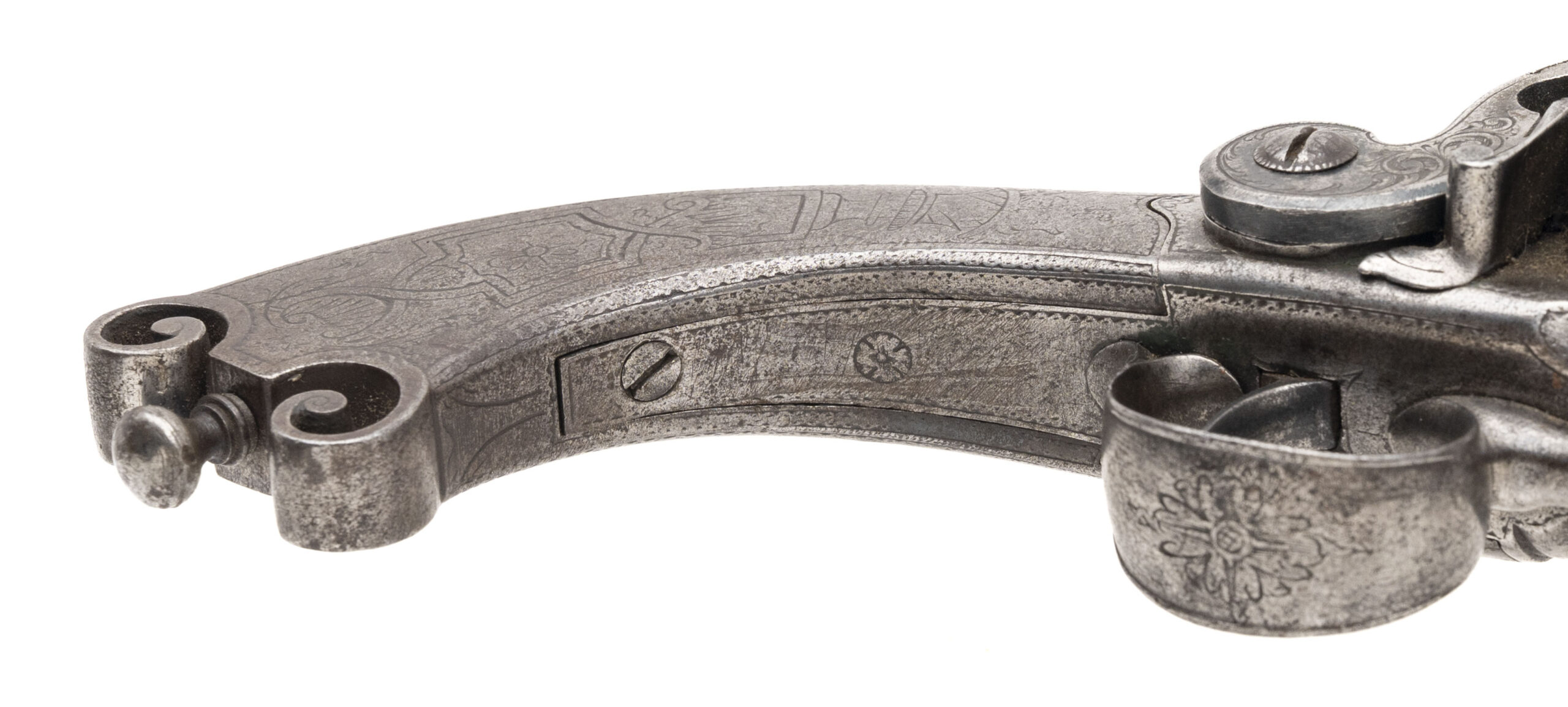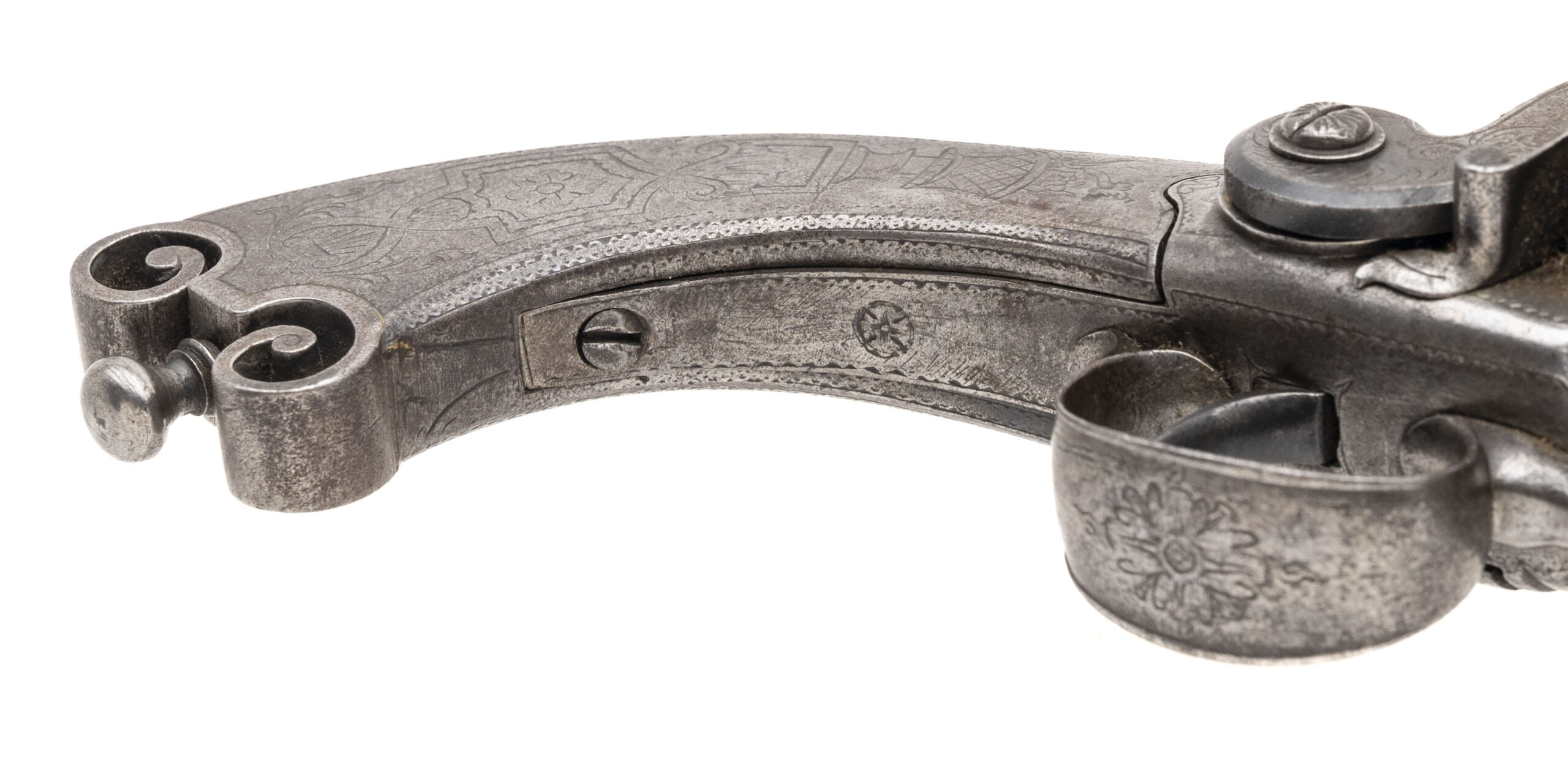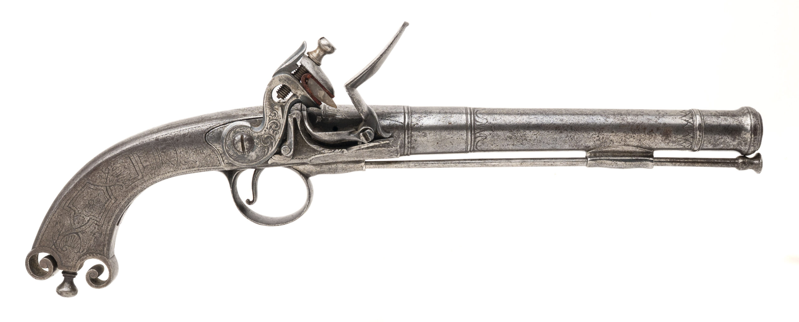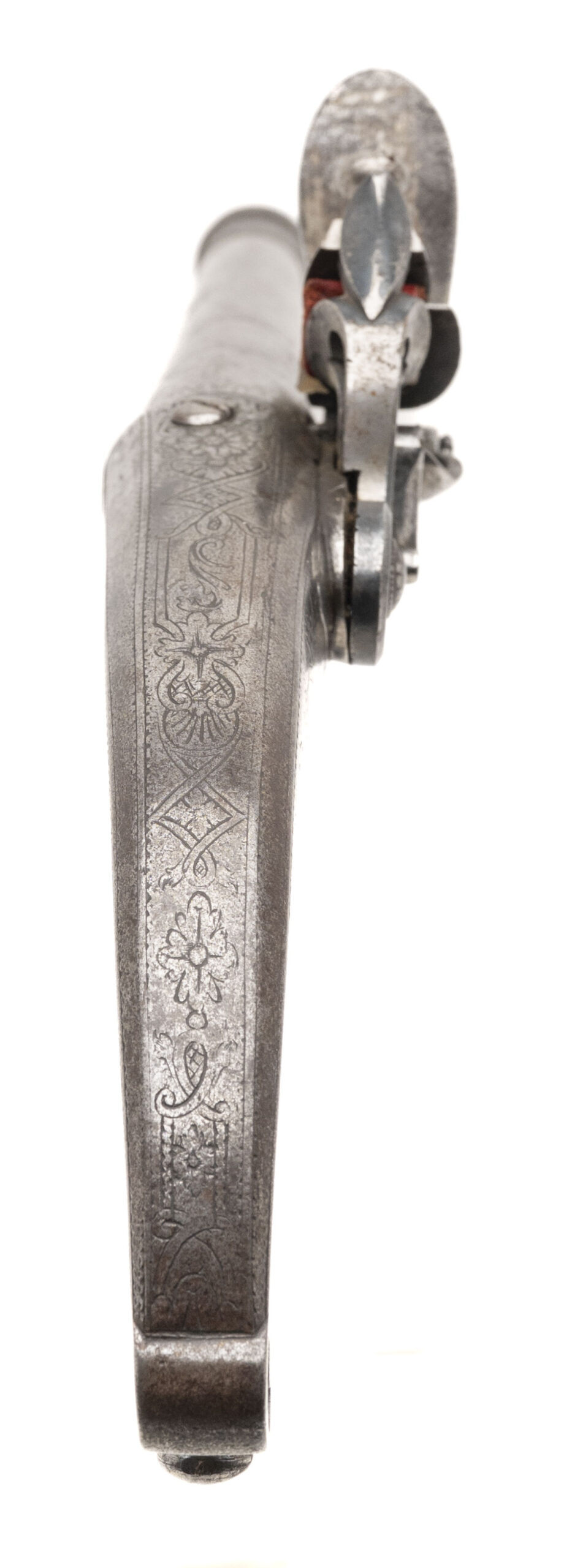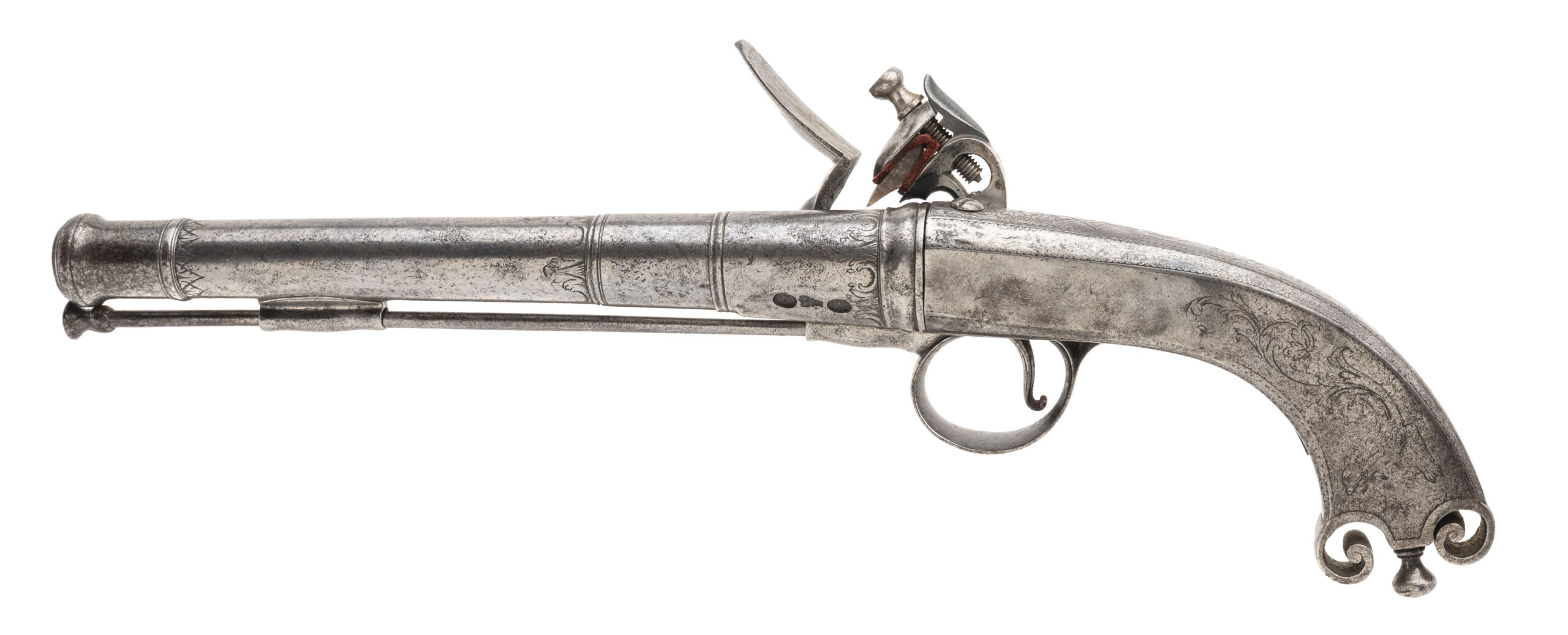 Pair of Scottish Flintlock Pistols by W. Brander. Unusual pair of London Made Scottish style pistols by W. Brander. These are classic Scottish style all metal guns. Barrels are 8” and total length are 13 ½”. The only deviation from the classic Scottish style of these guns is the Inverted V spring style lock. William Brander was a London gunsmith from 1752-1789. Along with this gun comes a binder that has different examples of guns that he made. None that we found were in the Scottish style. All of his guns are of excellent quality and the Metropolitan Museum of Art has a pair in their collection.