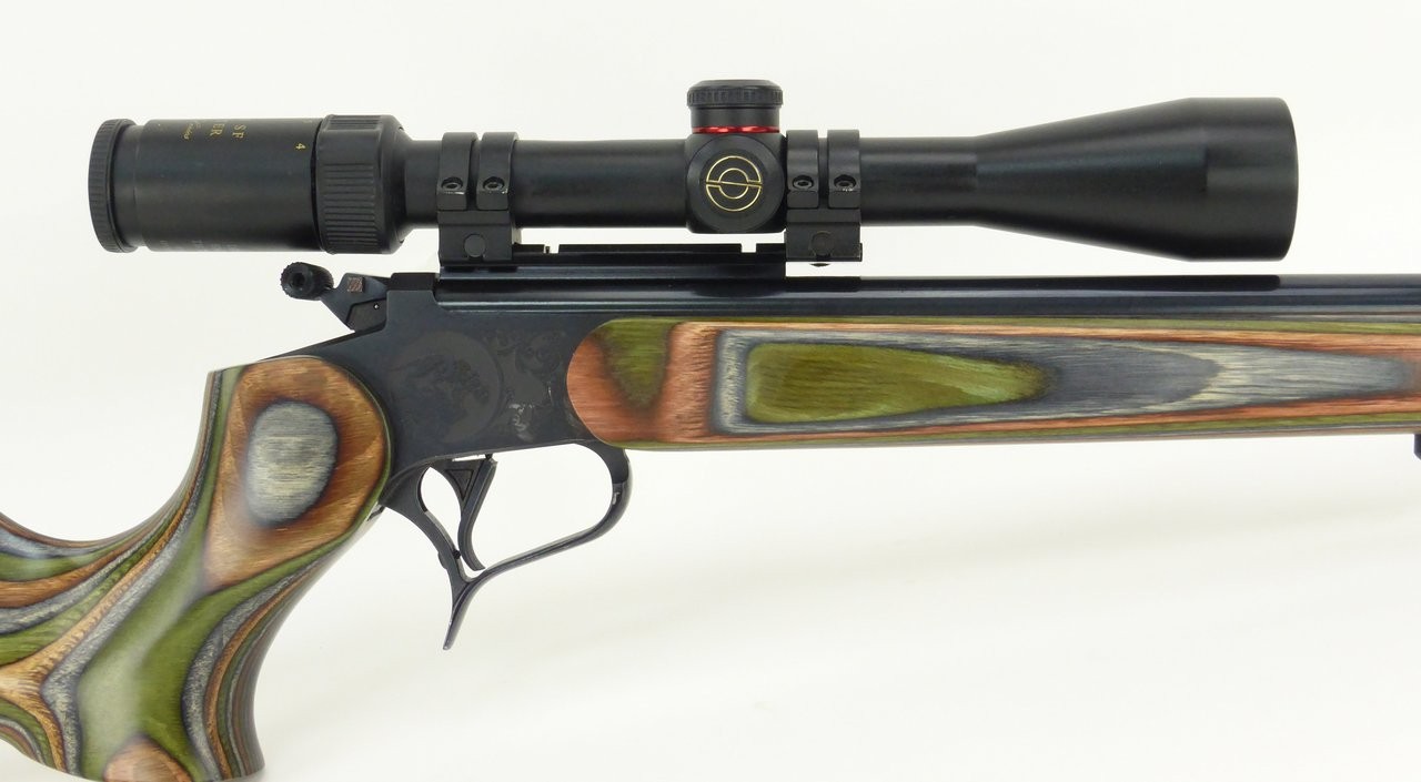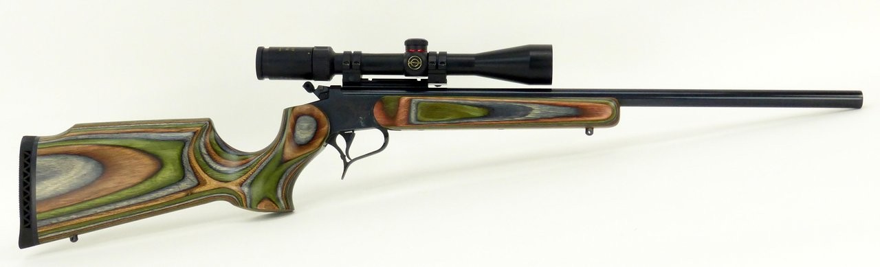 Thompson/Center Arms Contender 7-30 Waters caliber rifle. Single shot rifle with 23” heavy barrel in popular 7-30 Waters caliber. Has a camo laminated stock and Simmons 4x12 scope.