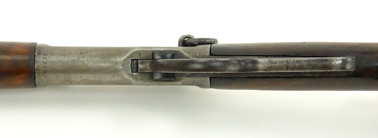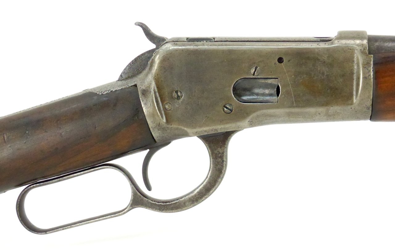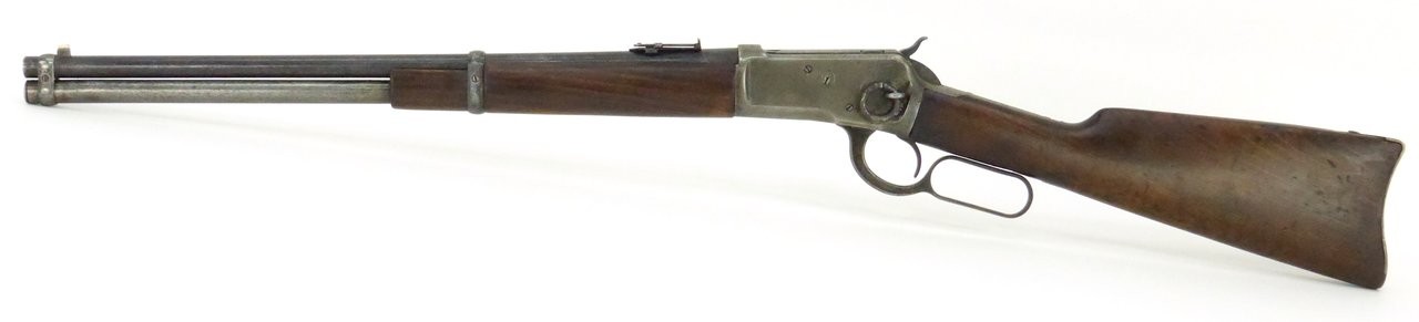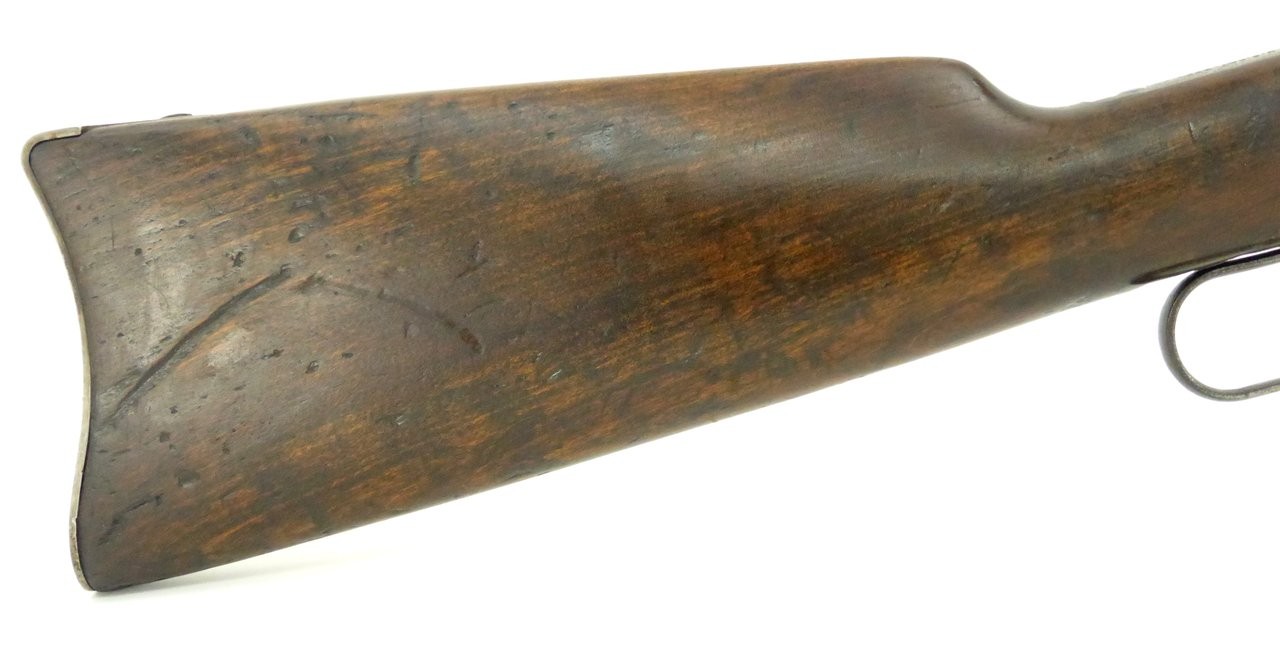 Winchester 92 .38 WCF caliber carbine. Saddle ring carbine manufactured in 1909 with 20¼” barrel. Bore has strong rifling with areas of pitting. Metal has a gray-brown patina with areas of surface etching. Wood shows dents and dings with some age cracks on the right side of the stock by the tang. A crack has been expertly repaired on the left side of the stock by the end of the tang. Good overall condition.