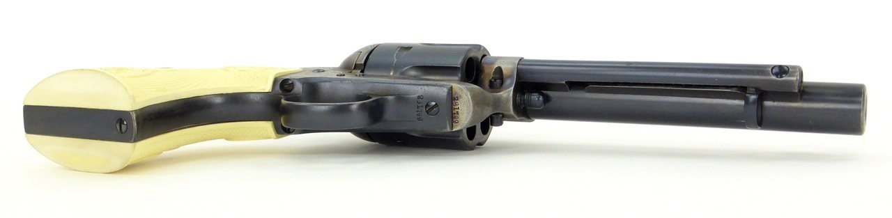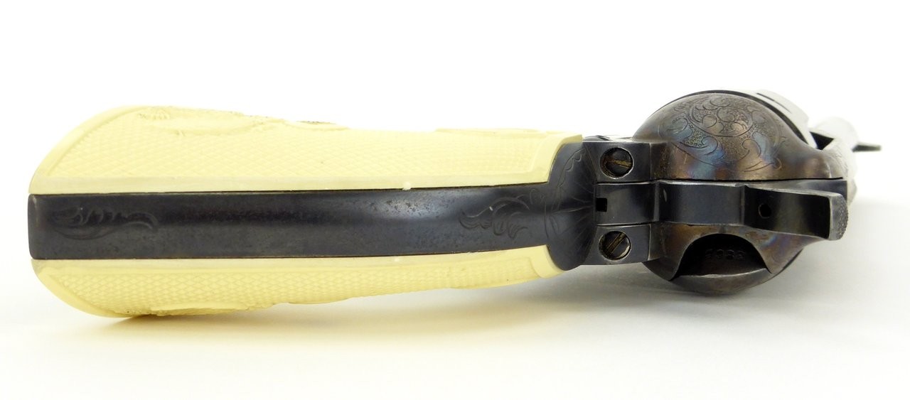 Colt Single Action Army .38 Special caliber revolver. Interesting rework with 1st gen frame and 2nd gen barrel and cylinder. The frame has been lightly engraved.