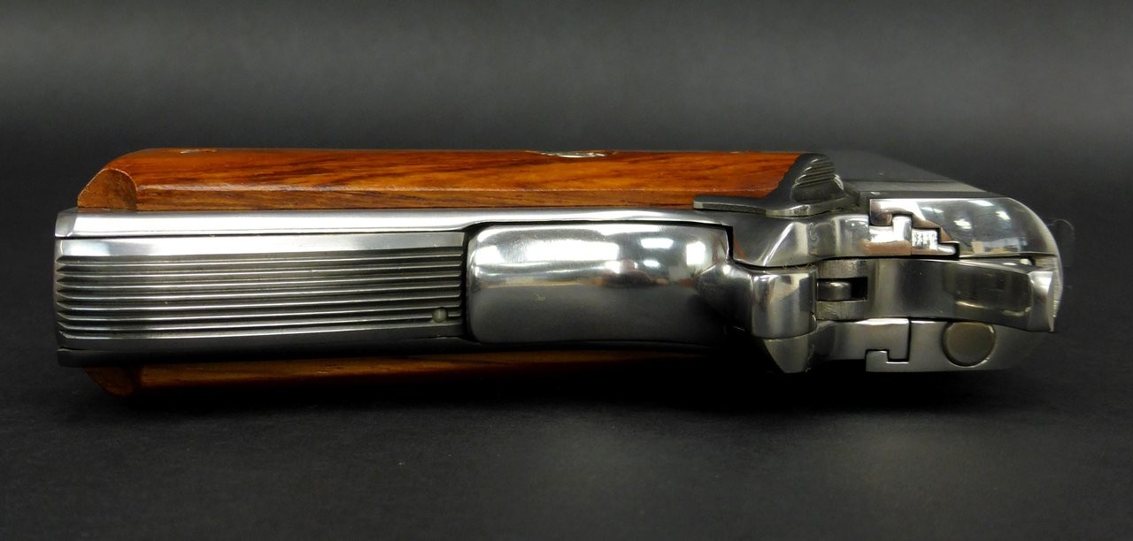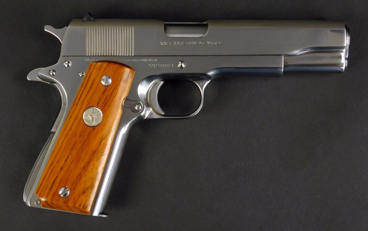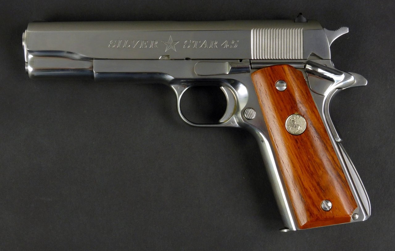 Colt Government .45 ACP caliber pistol. Rare Silver Star Special Edition bright polished stainless steel. Only 1,000 were made in 1984. Excellent condition with wooden case. A very desirable Colt 1911 pistol.