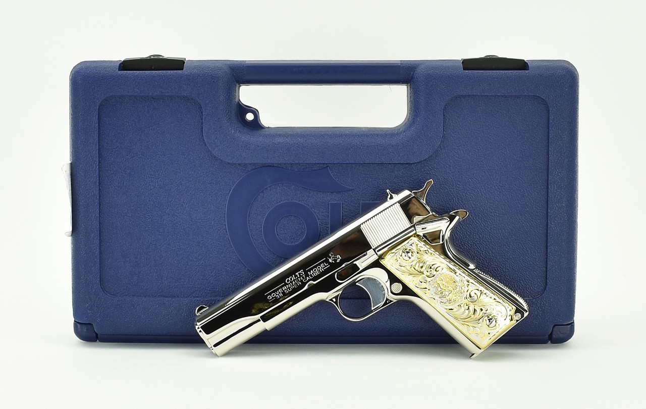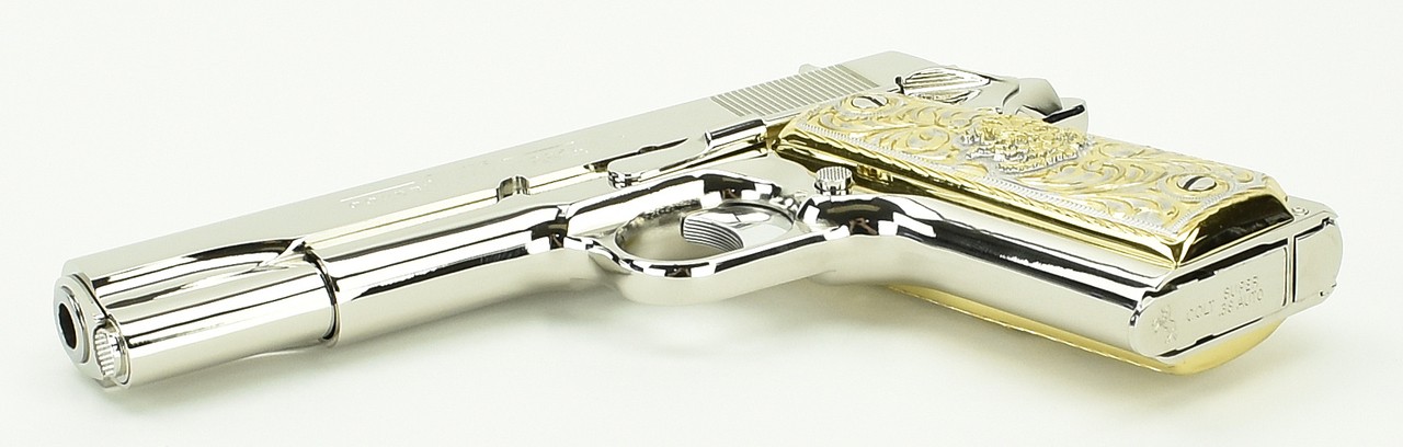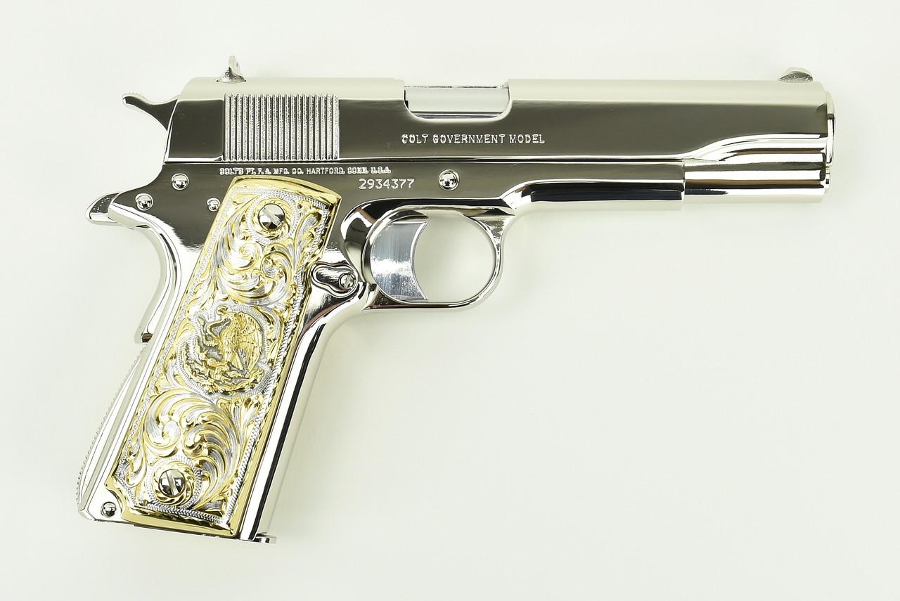 Colt Government .38 Super caliber pistol. Customized with bright nickel finish and silver and gold Mexican grips. New.