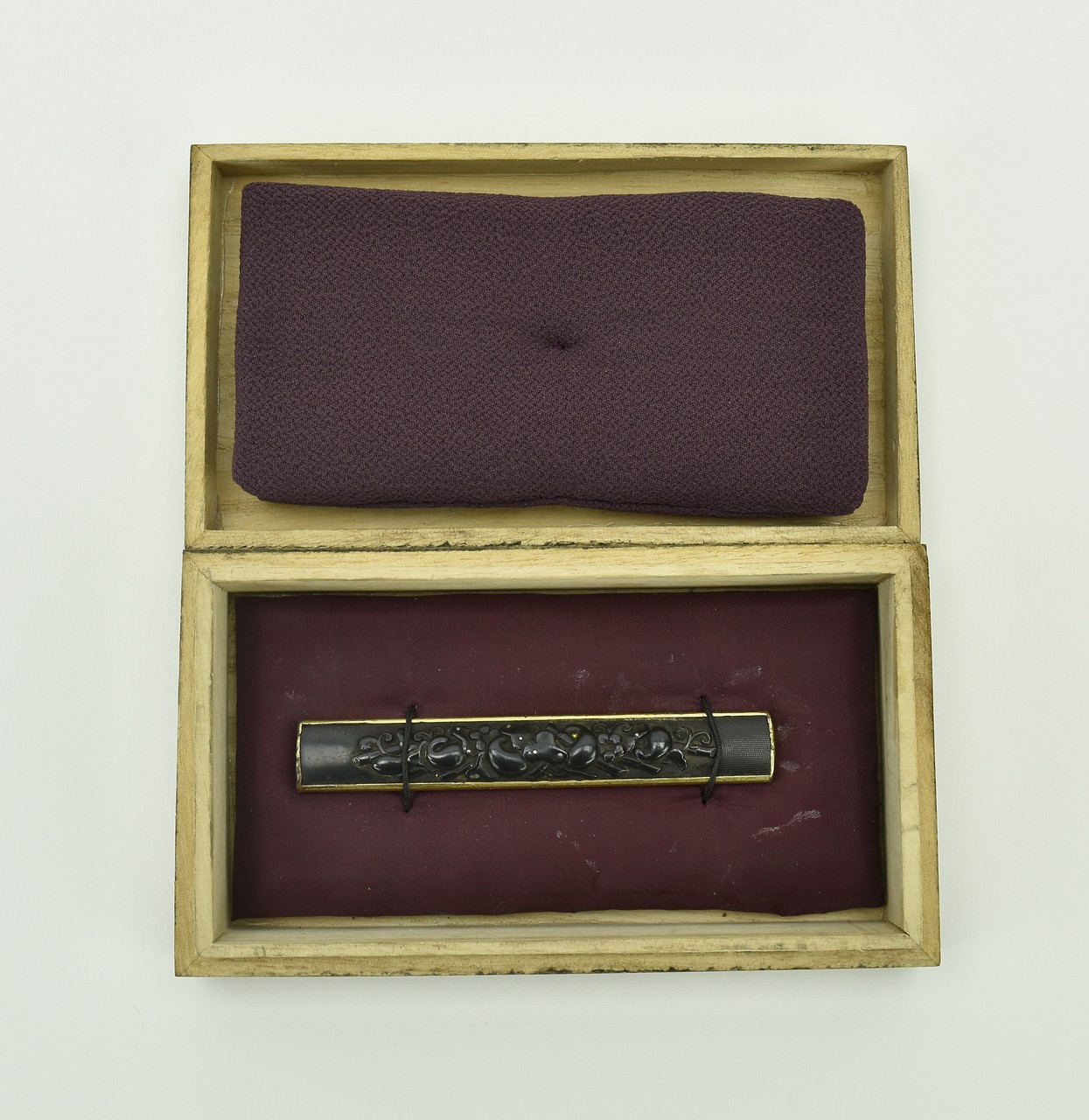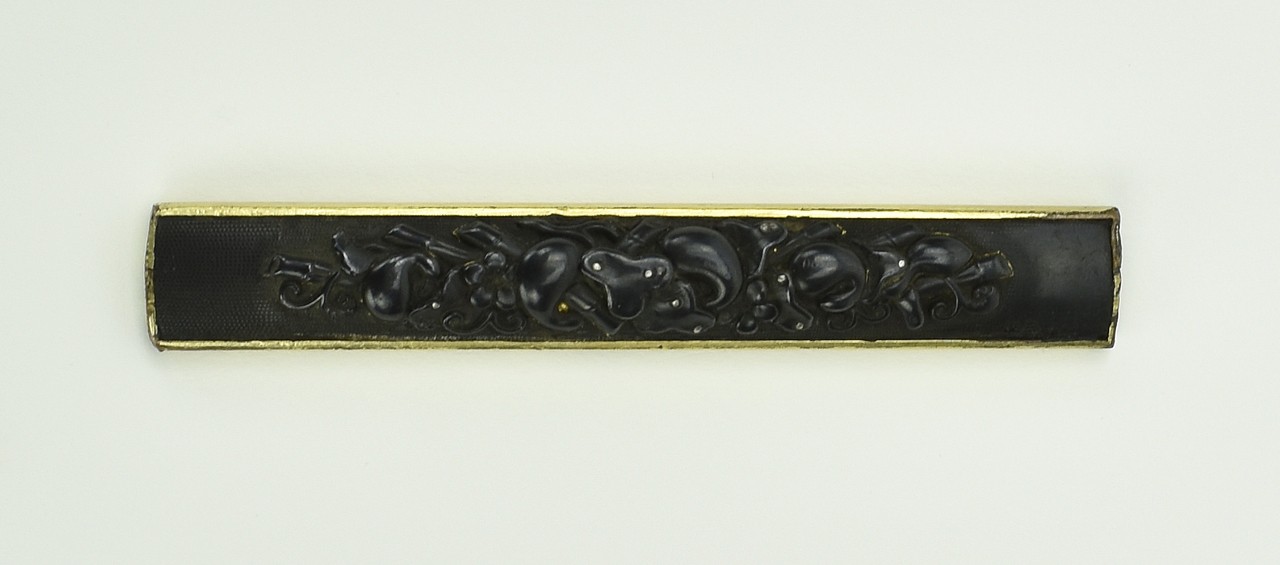 Kinko Kodzuka. Polished shakudo ground. Gourds on vines on trellis in high relief with gold highlights. With N.B.T.H.K. Hozon certificate. Ko Goto Kodzuka.