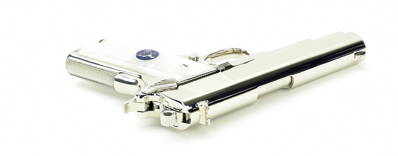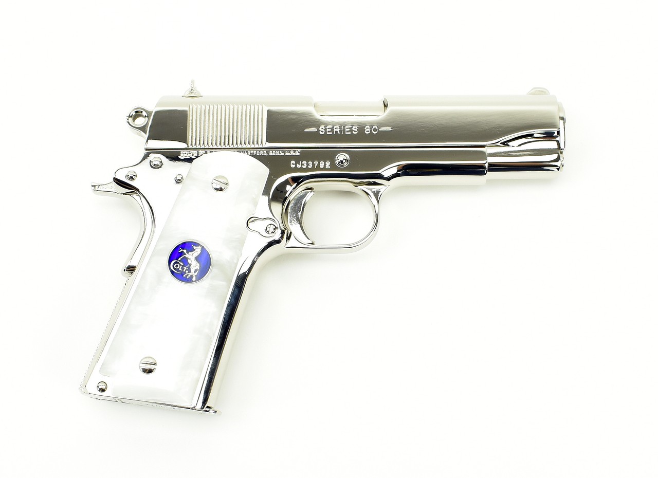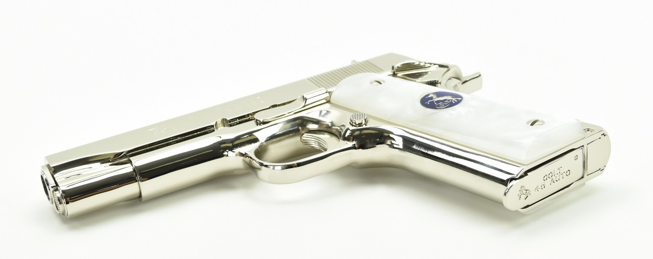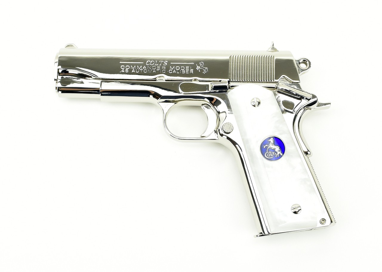 Colt Commander .45 ACP caliber pistol. Customized with bright nickel finish and fancy grips. Excellent condition with box and extra magazine.