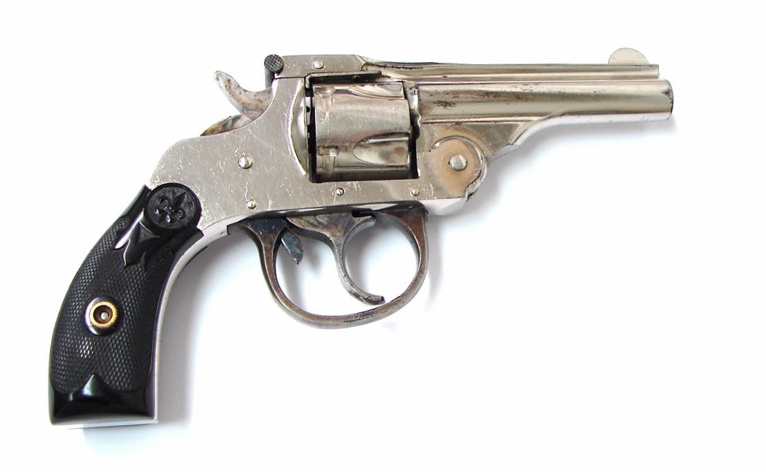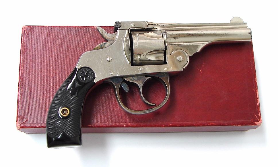 Thames Arms Top Break .32 caliber revolver. Pocket pistol in original box. Excellent condition with 99% of the original nickel finish. Bore is excellent as are grips. Box is very fine with just minor edge wear. Very good piece if you have a small frame pocket pistol collection.