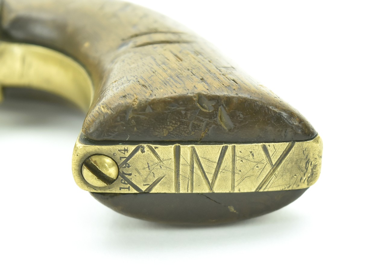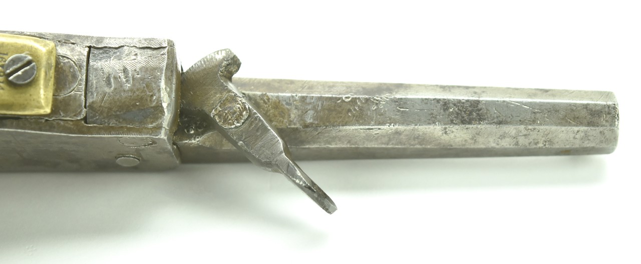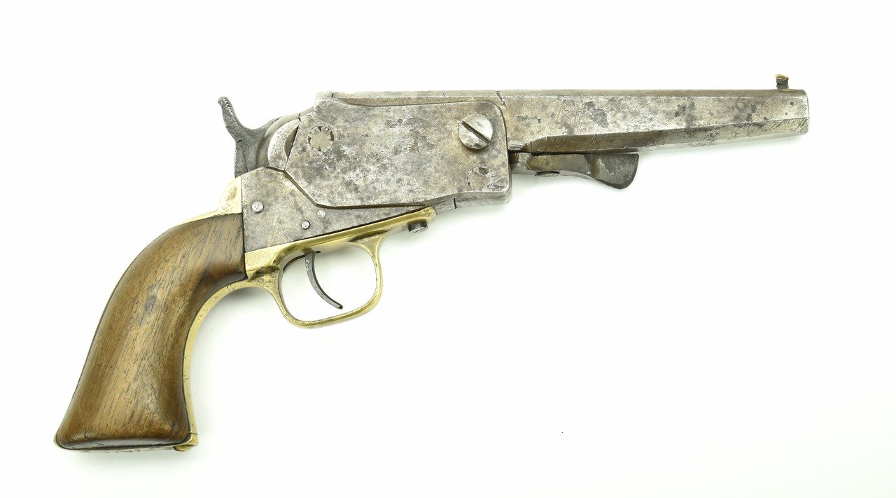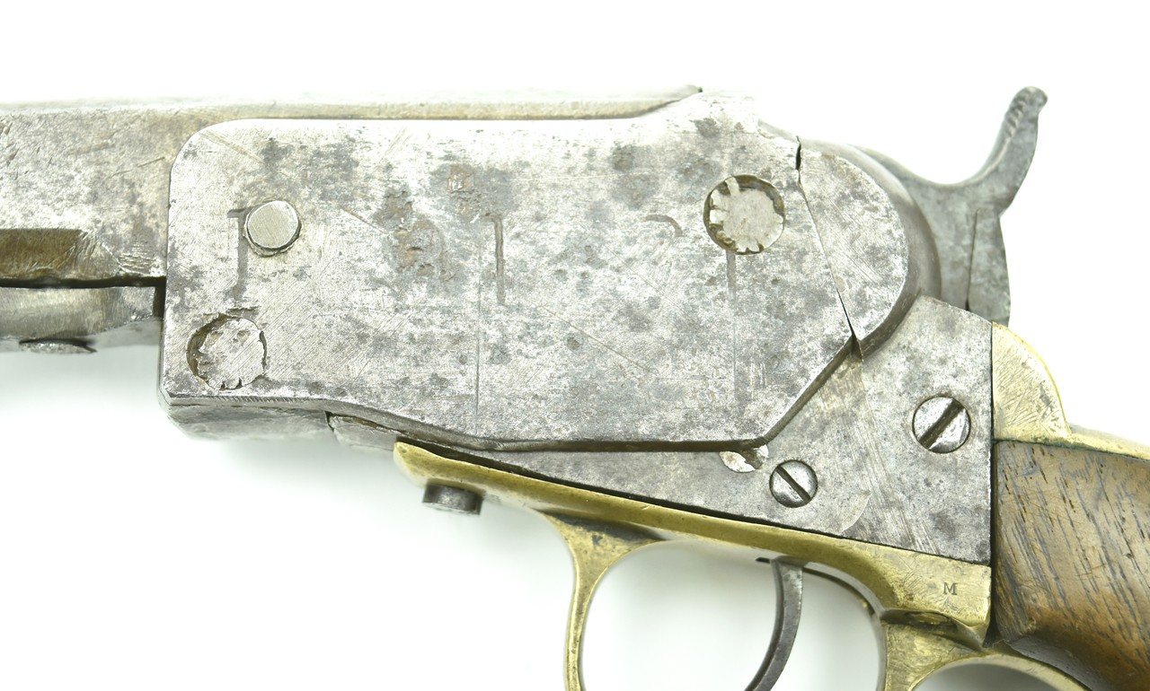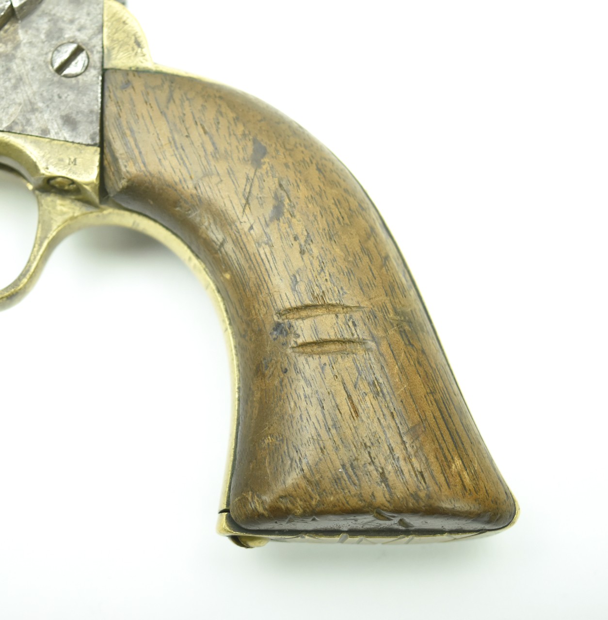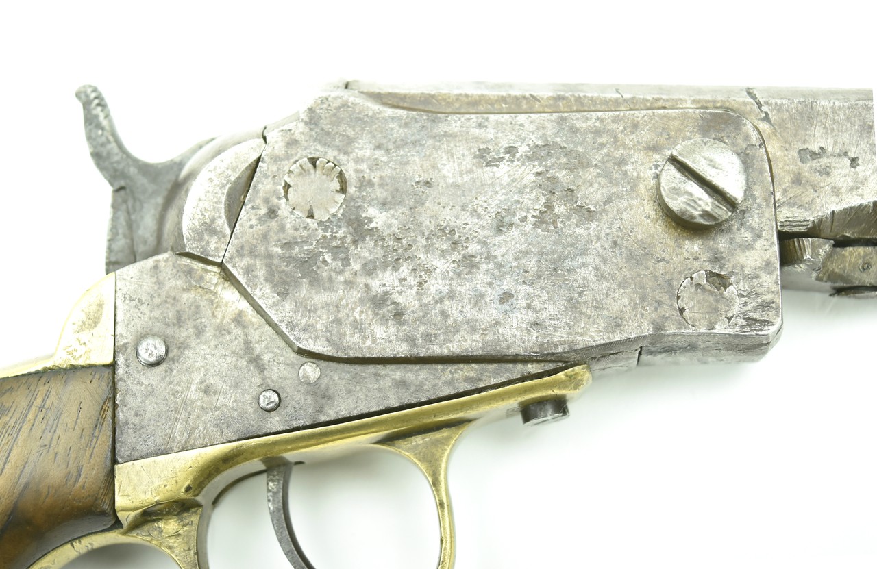 Colt 1849 Pocket Revolver Converted to Single Shot. Made in 1860. This gun has been converted to a tip up .32 Rimfire gun. There is a lever on the underside of the barrel that flips to the side to unlock the barrel. Very unusual. All work looks to be done in period of use.