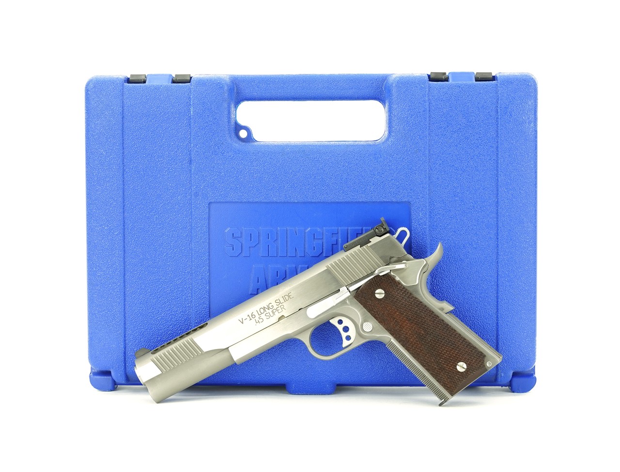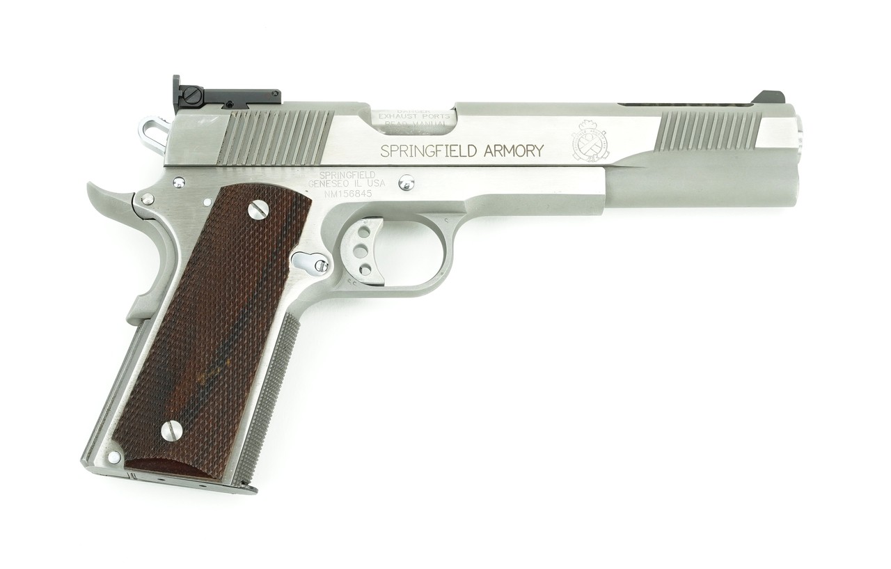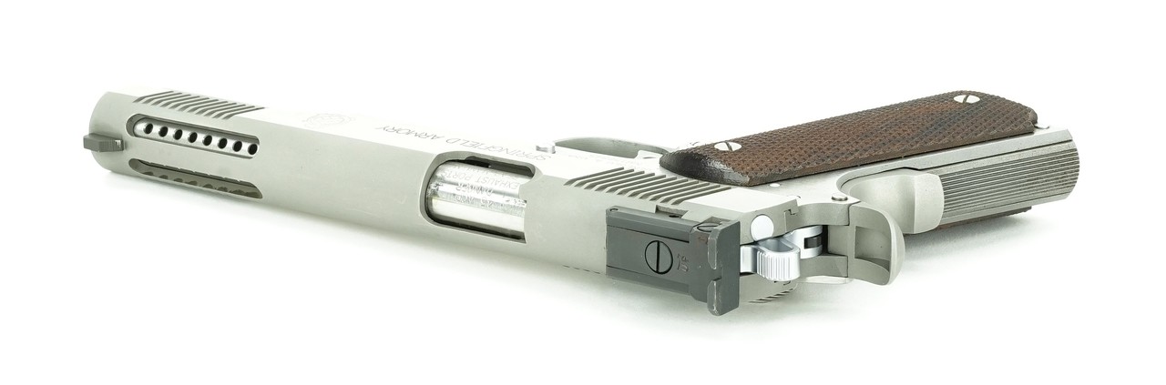 Springfield 1911-A1 Long Slide V-16 .45 ACP Caliber Pistol. 6” Long slide with ported barrel and slide, adjustable sights, and checkered grip frame. A scarce and desirable model. Excellent condition with box and extra magazine.