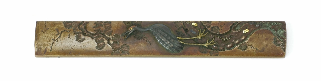 Kinko Kodzuka. Polished copper ground. Crane in high relief standing in stream below pine tree. Signed.