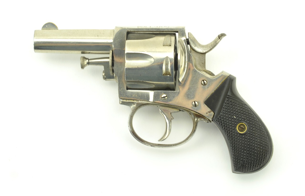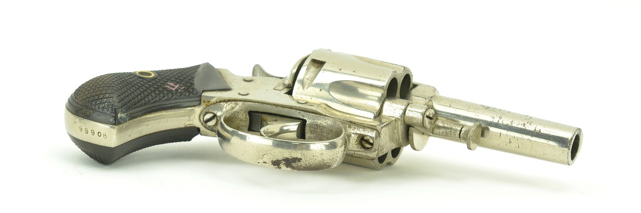 Forehand & Wadsworth “British Bulldog” .38 Smith and Wesson caliber revolver. Good bore with strong rifling and a few spots of corrosion. Action works perfectly Gun has approximately 97-98% original nickel. We believe this gun to be a “Fourth Issue” in the 90 XXX range. Made before 1896.