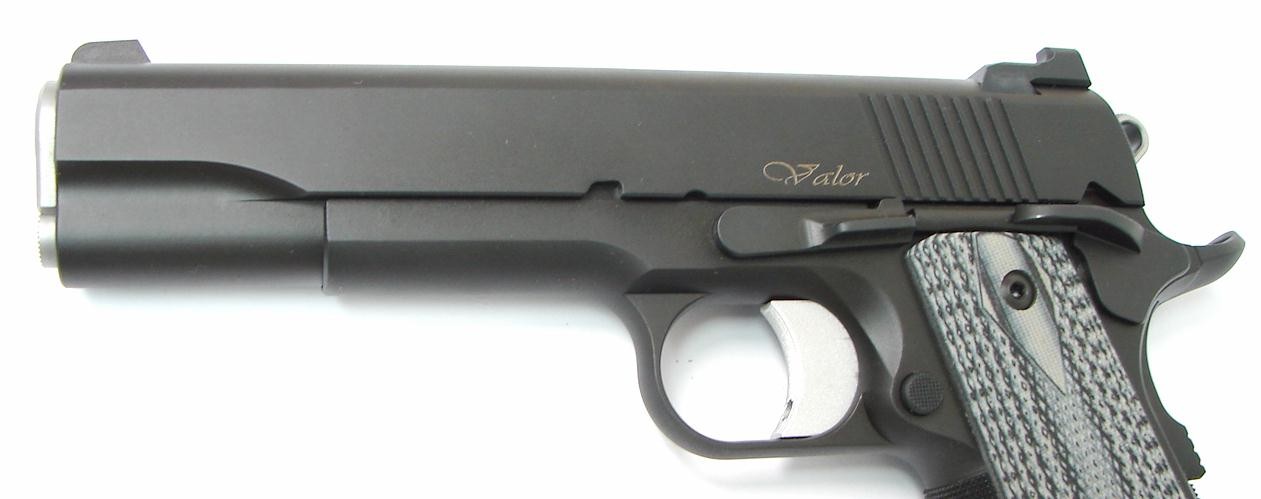 Dan Wesson Valor .45 ACP caliber pistol. A superb 1911 from a great American Manufacturer. The Valor has all the goodies! Heinie sights, beavertail, aggressive texture. Match grade barrel. This gun is built for high performance! New.