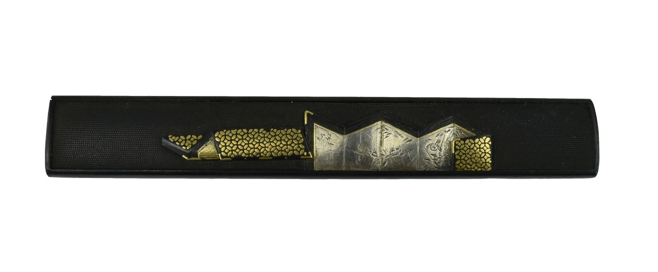 Kinko Kodzuka. Shakudo nanako ground silver painted folding screens with shakudo border. Screen has a scene depicting floral motif. Reverse has gold cat-scratch pattern. Unsigned.