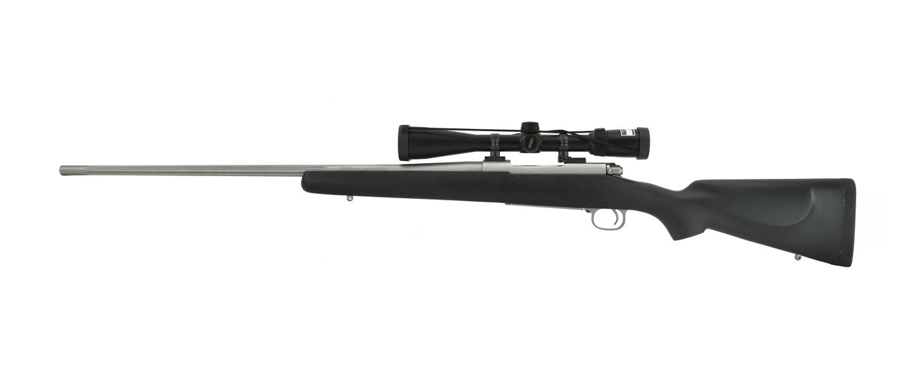 Winchester Model 70 .338 Winchester Magnum caliber rifle. Extreme Weather Stainless model with fluted barrel and composite stock. Has a Nikon 4.5x14.