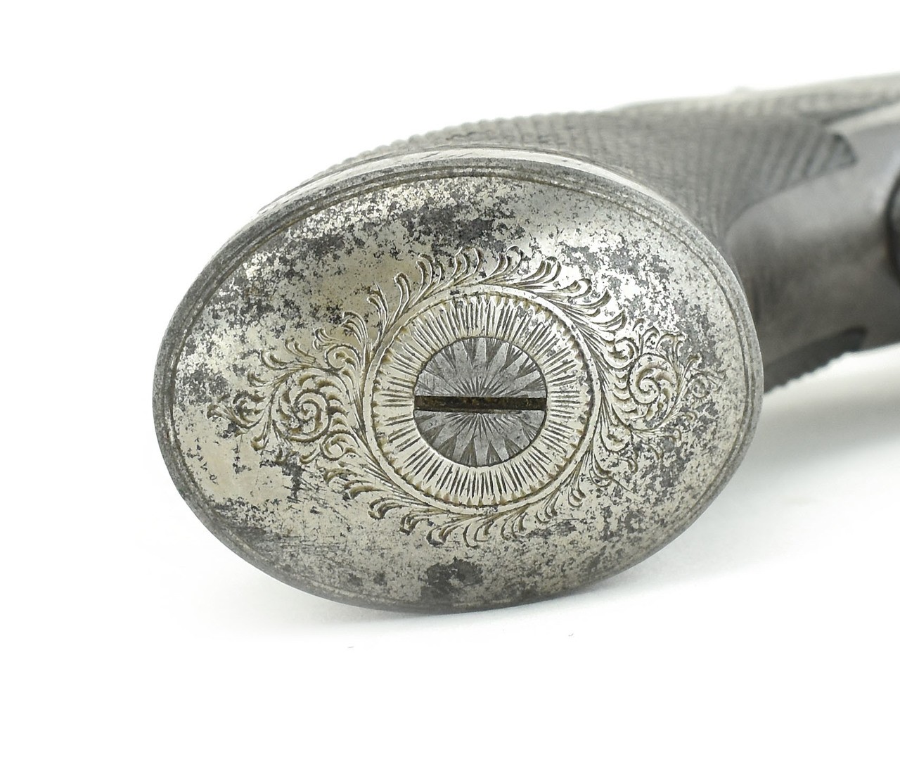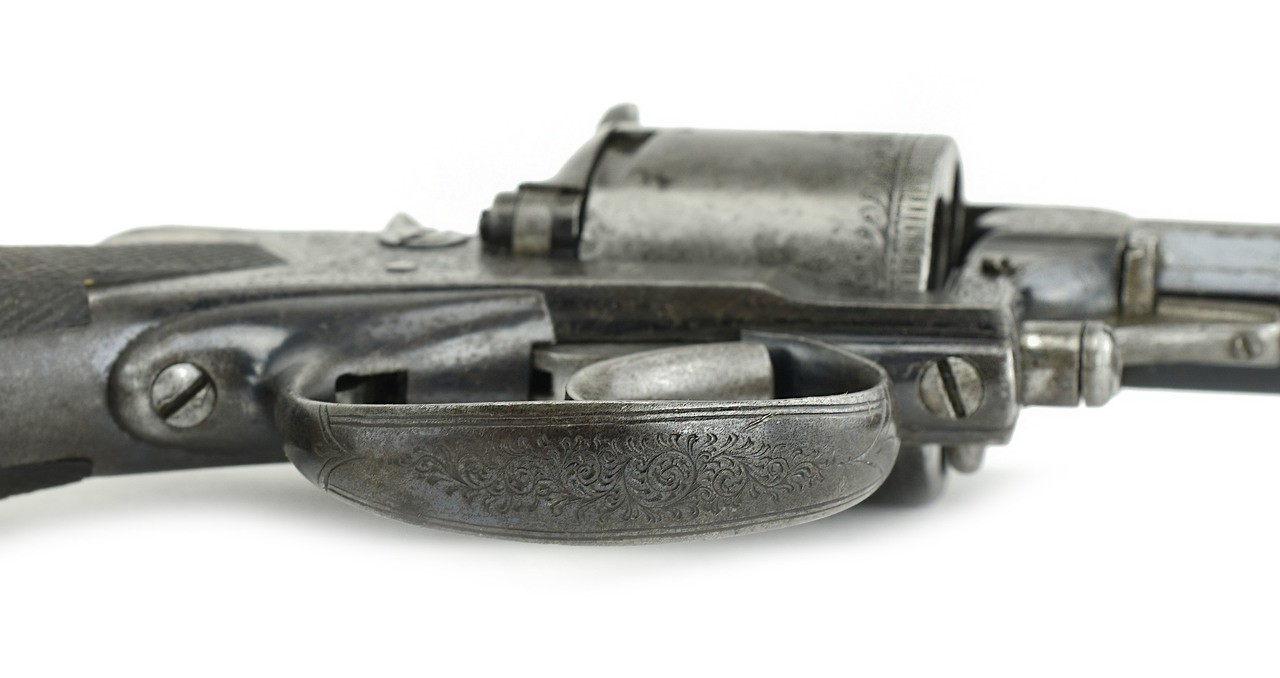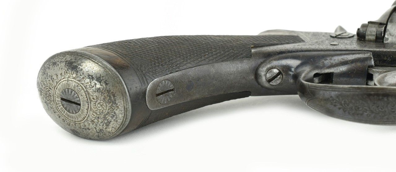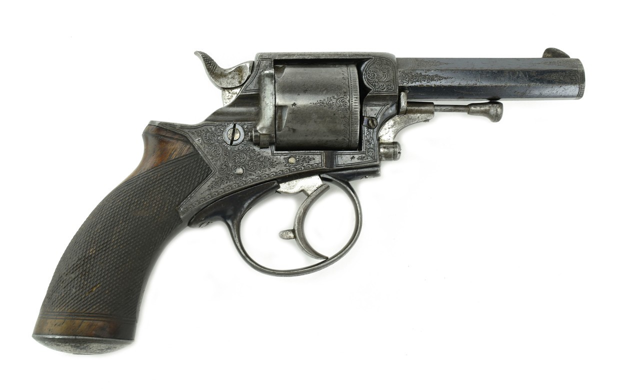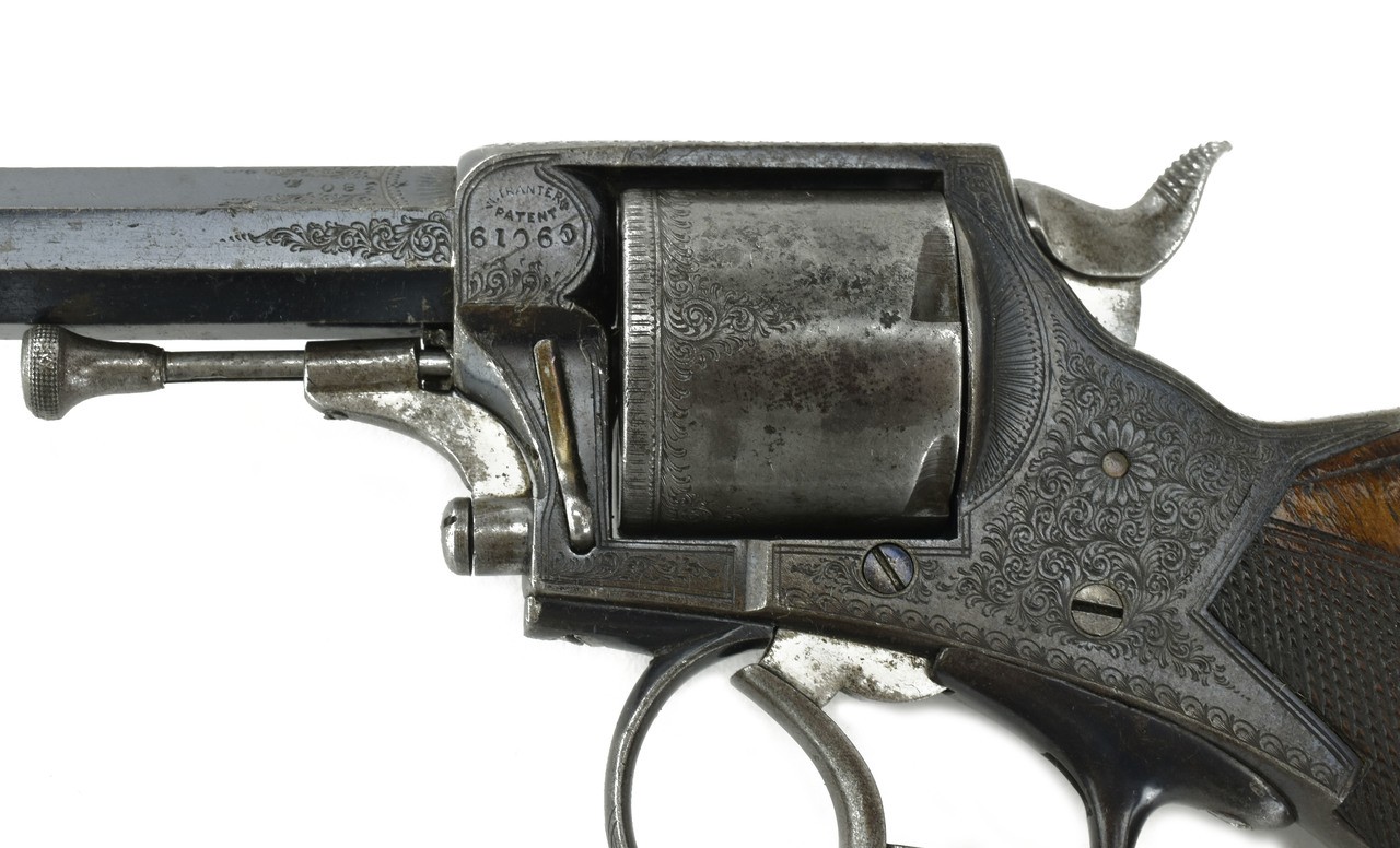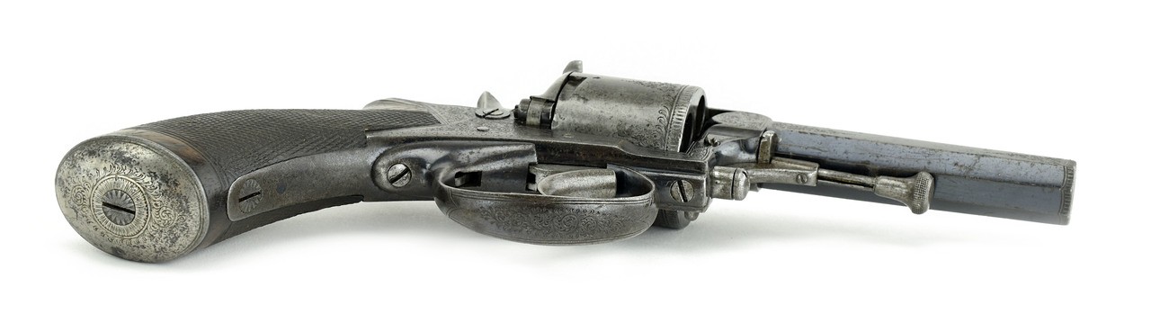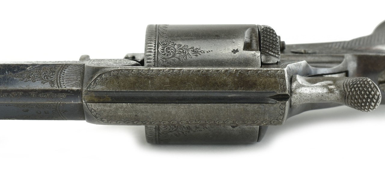 Tranter Revolver, 5 Shots, .380 Caliber Centerfire. Barrel is inscribed “S. Grant, 67 St. James St. London”. Bore is very good. Action works perfectly. Gun is factory engraved with tight scrolls. Grips are very good with fine checkering. Butt cap is engraved. Cylinder was cased hardened and some colors are visible but mostly faded to an even gray patina. The frame and barrel are blued and have light nicks and dings, mostly on the barrel. The frame, trigger guard and butt cap have no nicks or dings. Very nice double action Tanter!