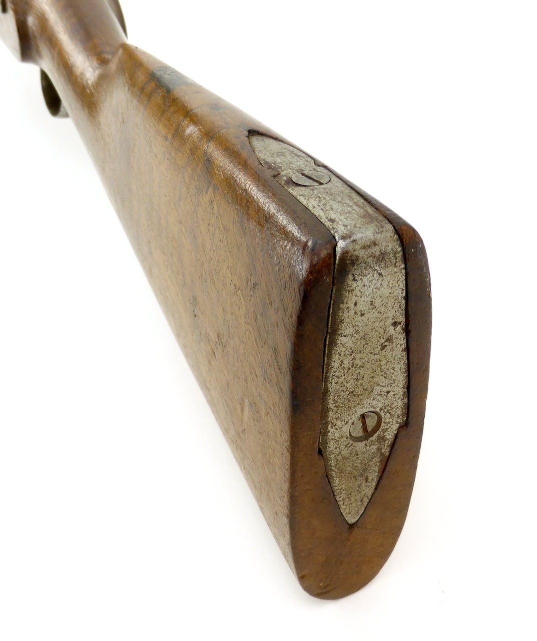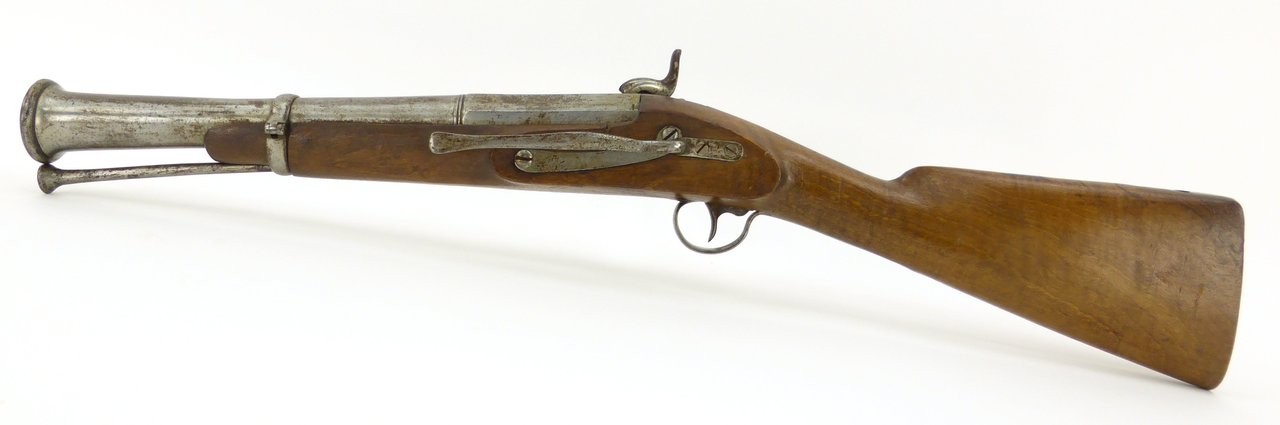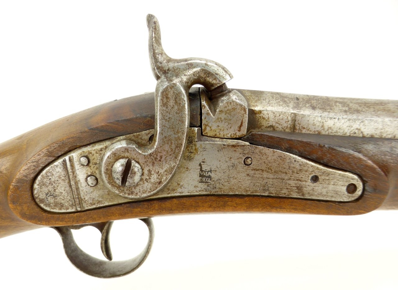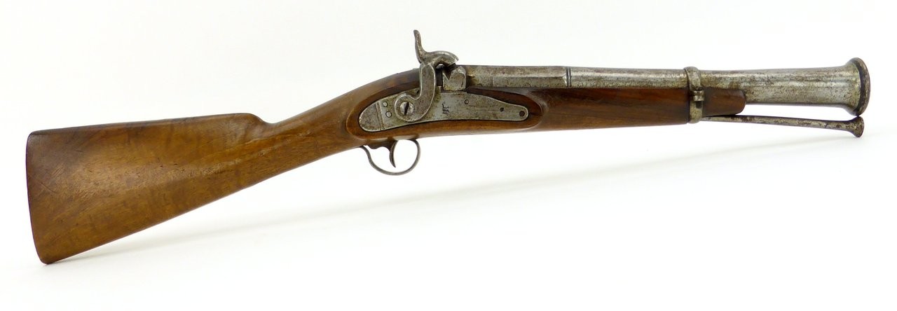 Spanish Percussion Blunderbuss with belt hook. Barrel length is 13¾”, overall length is 27½”. Lock is marked in sink “Vila Dell”. Action works fine. Stock is very good plus. Metal parts are very good with some light stains but no pitting. Interesting Blunderbuss of this size to have a belt hook!
