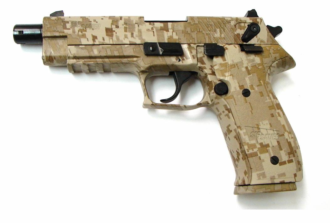 Sig Sauer Mosquito .22 LR caliber pistol. Chambered in .22 LR, 90% the size of a P226, digital camo finish. Decocker, magazine safety, box, papers with one magazine. New.